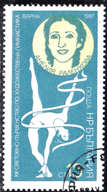 Eine Marke aus Bulgarien (MiNr 3589) zu den Weltmeisterschaften 1987 in der Rhythmischen Sportgymnastik in Varna zeigt Iliana Raycheva Raeva bei einer Übung mit der Keule.