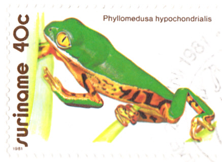 Auf einer Marke aus Surinam (MiNr 948) wird ein Phyllomedusa hypochondrialis gezeigt. Michel nennt ihn Makigreiffrosch (Phyllomedusa hypochondrialis).