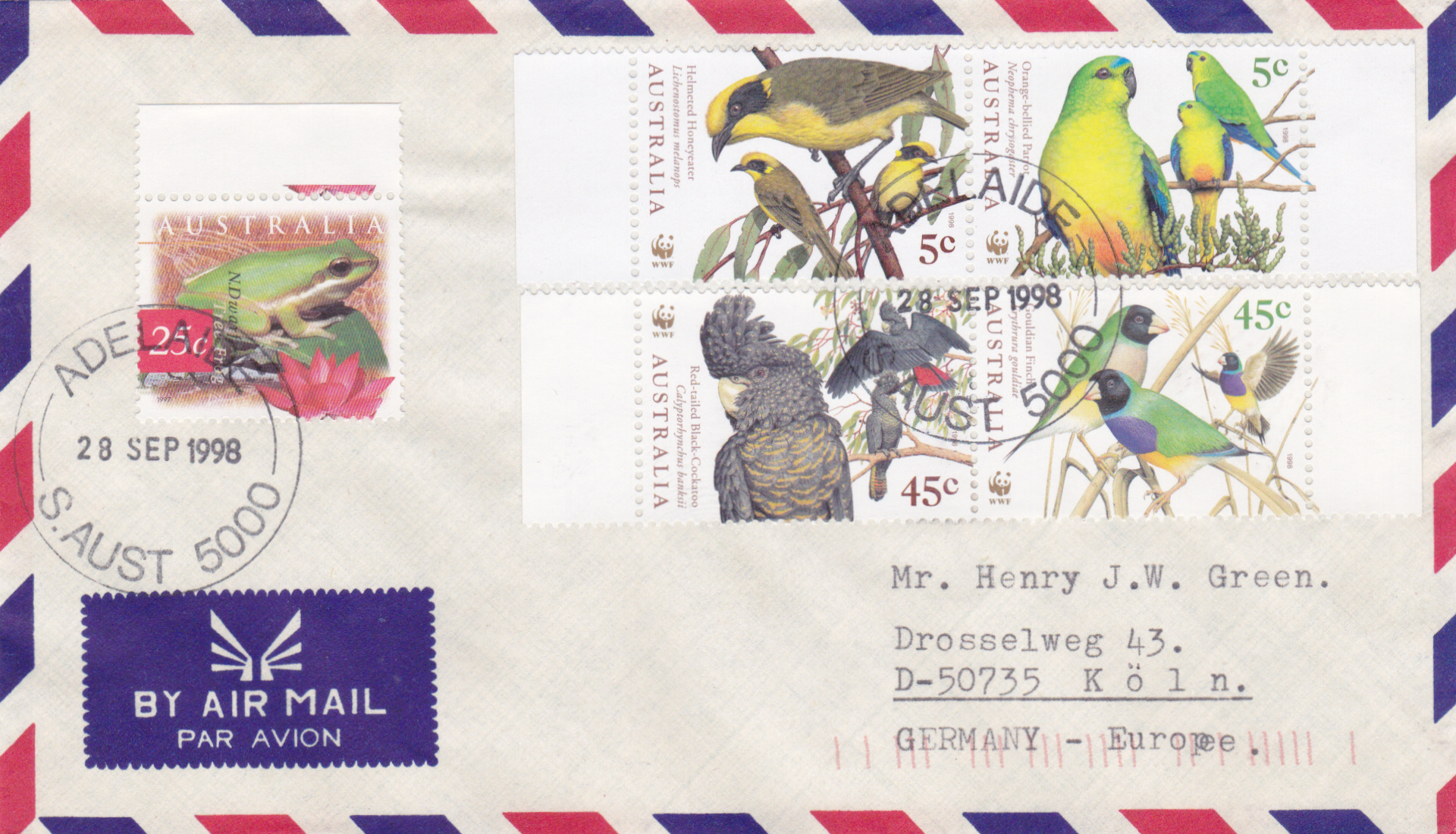 Brief mit Luftpost vom 28.9.1998 von Adelaide nach Köln mit der Marke zu 25 Cent mit einem Baumfrosch (Litoria bicolor) und einer Indische Lotosblume (Nelumbo nucifera) (MiNr 1631) und den beiden Zusammendrucke "Weltweiter Naturschutz: Bedrohte Vogelarten" (MiNr 1744/1745 und 1746/1747).