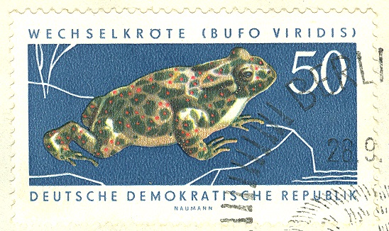 Wechselkröte bringt uns die MiNr. 981 einer DDR-Ausgabe "Geschützte Tiere" in die Motiv-Sammlungen. Erstausgabetag war der 10. September 1963.