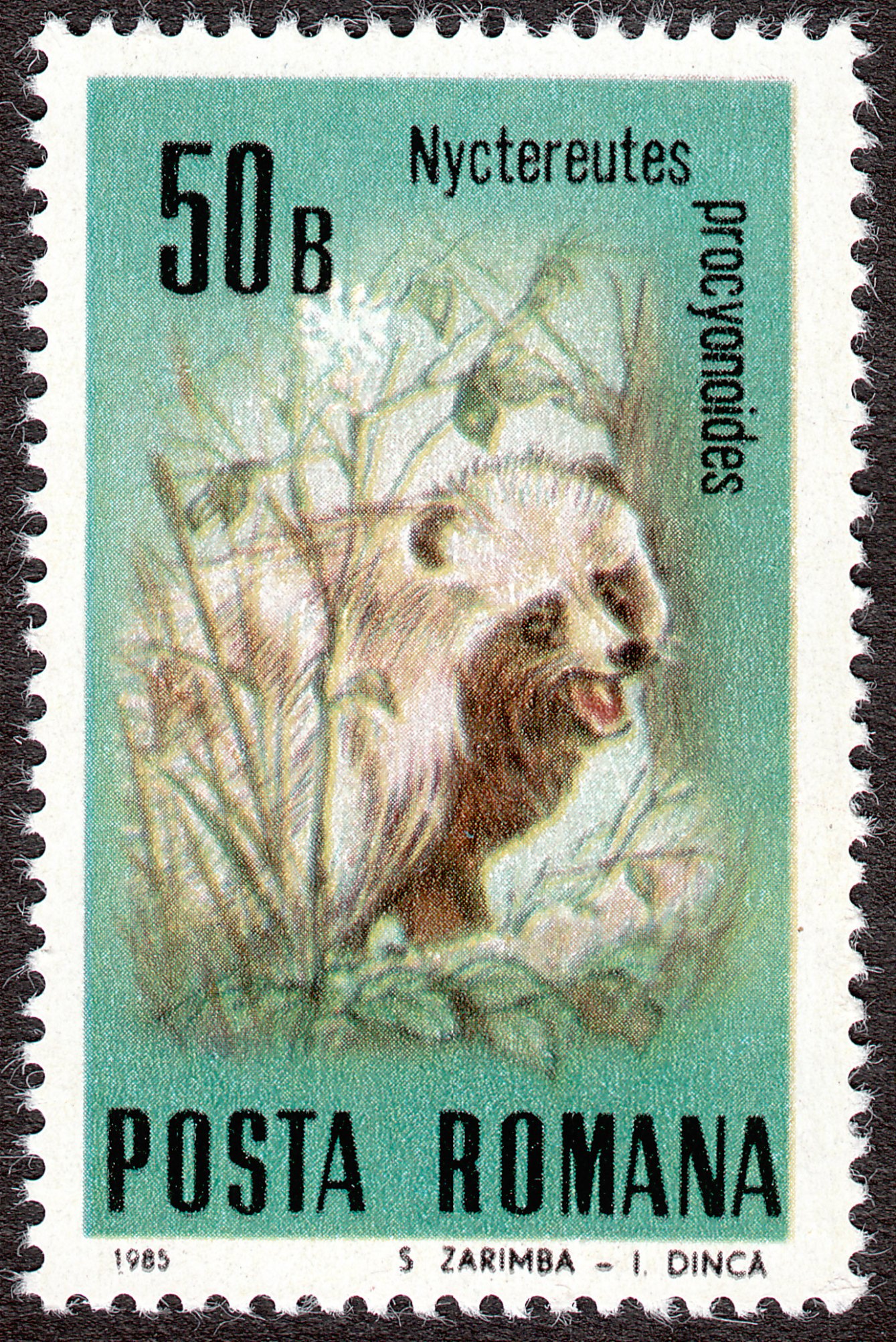 Hier ein Postwertzeichen aus Rumänien, das einen Marderhund zeigt: