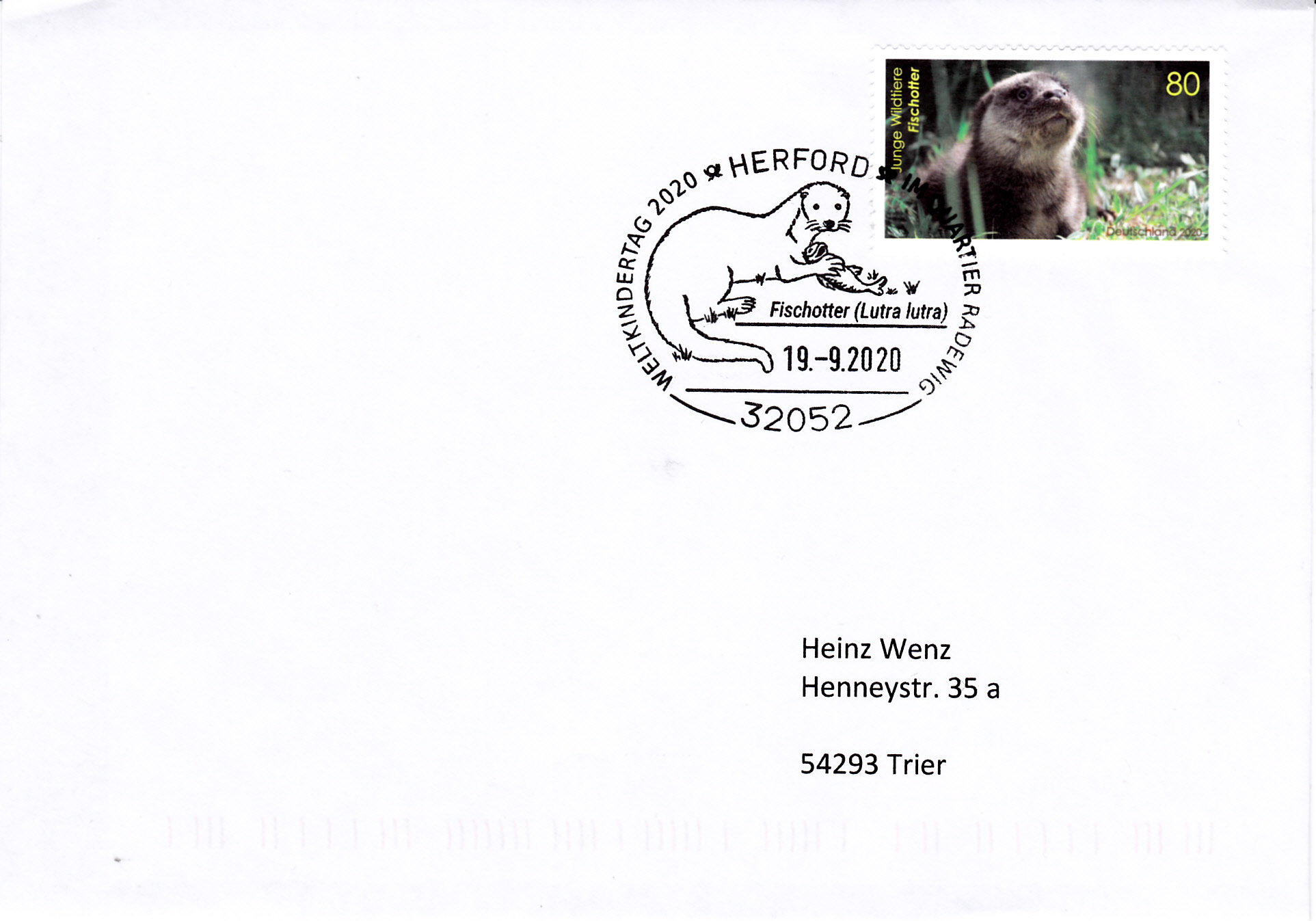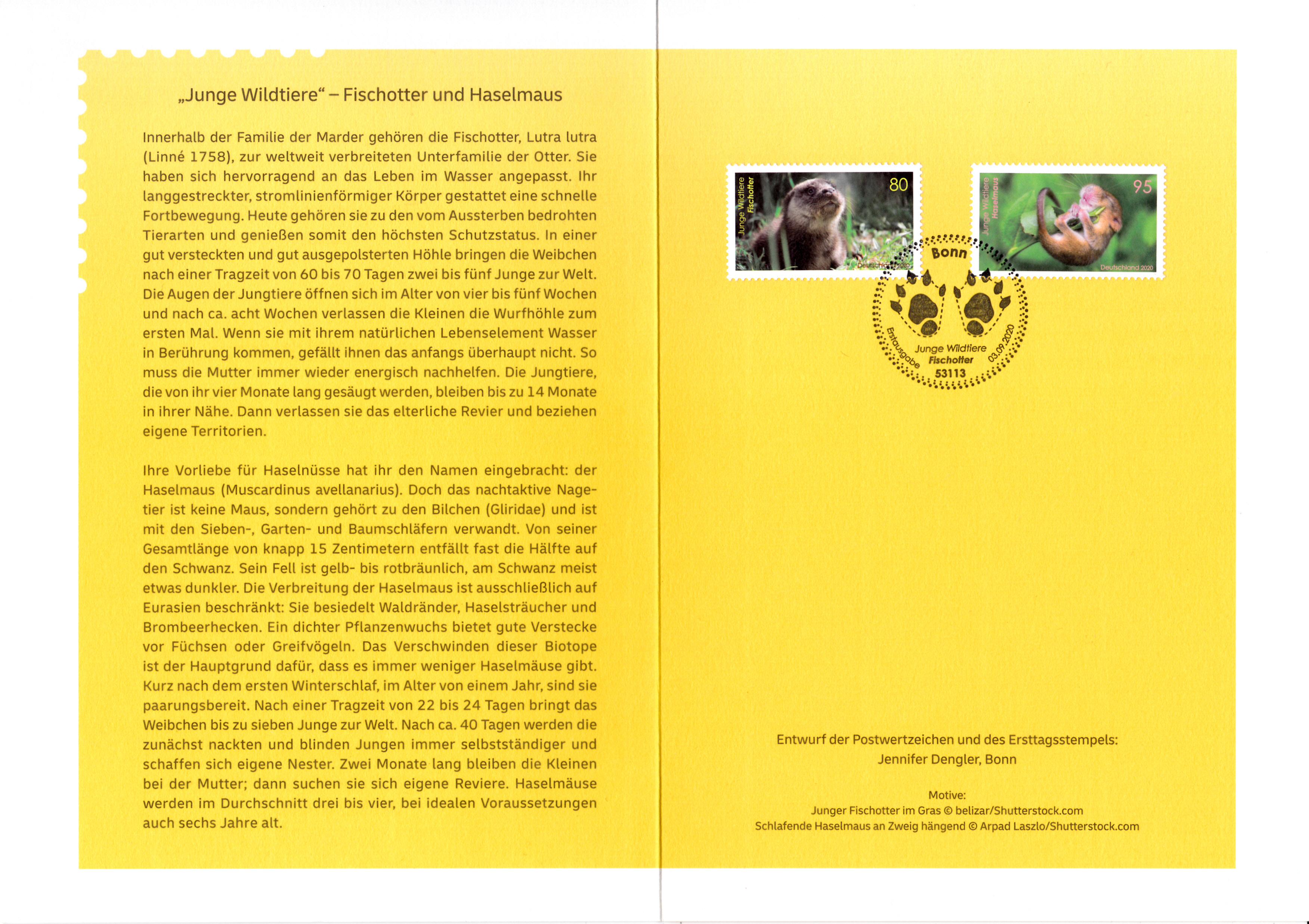 Ministerkarte des Finanzministers mit je einer Marke aus der Serie "Tierbabys" (MiNr 3562/63) mit den Motiven "Fischotter (Lutra lutra)" und "Haselmaus (Muscardinus avellanarius)". Je eine Marke ist mit dem Ersttagsonderstempel Berlin und mit dem Ersttagsonderstempel Bonn gestempelt.