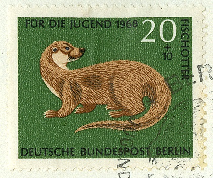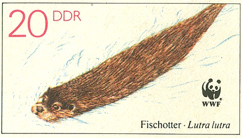 Welchen Stellenwert der Fischotter in der Kunst hat(te) zeigt dieser Fischotter aus Meißner Porzellan. Die Marke erschien anlässlich einer Ausgabe "250 Jahre Porzellanmanufaktur Meißen". Als so genannter "Sperrwert" mit einer Auflage von 1.100.000 Exemplaren ist der 15 Pfennig-Wert (MiNr. 776, dunkelgraublau/dunkelpurpurviolett) der philatelistische Höhepunkt in diesem Markensatz.