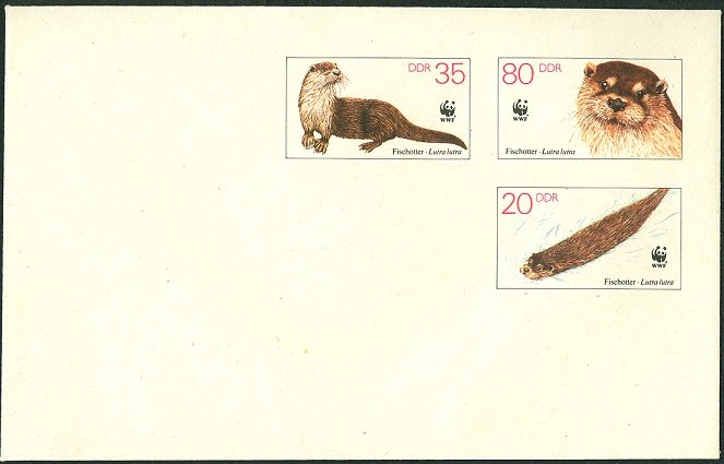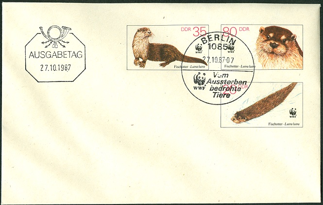 Am 27. Oktober 1987 verausgabte die Deutsche Post der DDR diesen U 7 mit mehreren Wertstempeln auf denen Fischotter-Motive zu sehen sind.