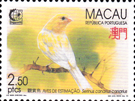 Diese Marke aus Macau aus einer Serie zur "Internationalen Briefmarkenausstellung SINGAPORE ’95" (MiNr 816) wird ein Kanarienvogel in der Farbe gelb gezeigt.