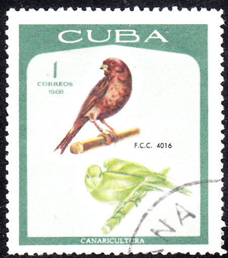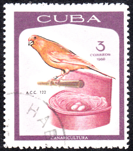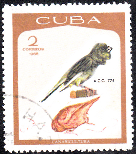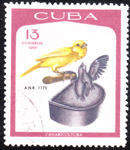 Aus einer Serie "Kanarienvogelzucht" aus Kuba stammt diese Marke (MiNr 1394) mit einem preisgekrönte Kanarienvögel. Auf der Marke ist vermutlich seine "Registriernummer" angegeben.