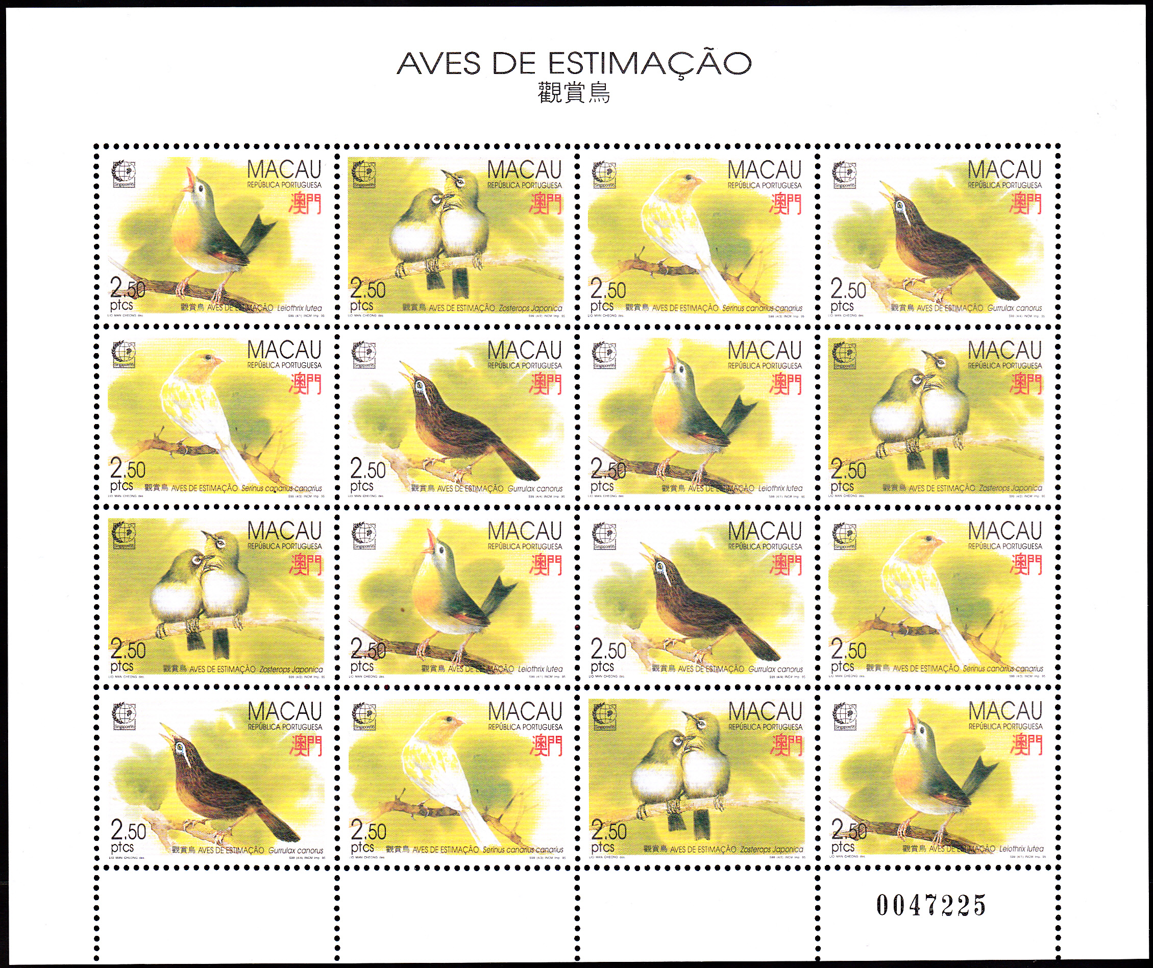 Die Marke aus Macau aus dem ersten Beitrag wurde zusammen mit drei weiteren Marken mit Vogelmotiven in einem Zusammendruckbogen hergestellt. In jeder Markenreihe sind die Marken in einer anderen Reihenfolge gedruckt. Hier ein kompletter Bogen: