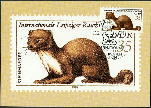 Die "Internationale Leipziger Rauchwarenauktion" war 1982 der Anlass für die Deutsche Post der DDR eine Markenausgabe mit Motiven von "Pelztieren" herauszugeben. Der 35 Pfennig-Wert zeigt einen Steinmarder. Die Ausgabe hatte am 23. Februar 1982 Ersttag.