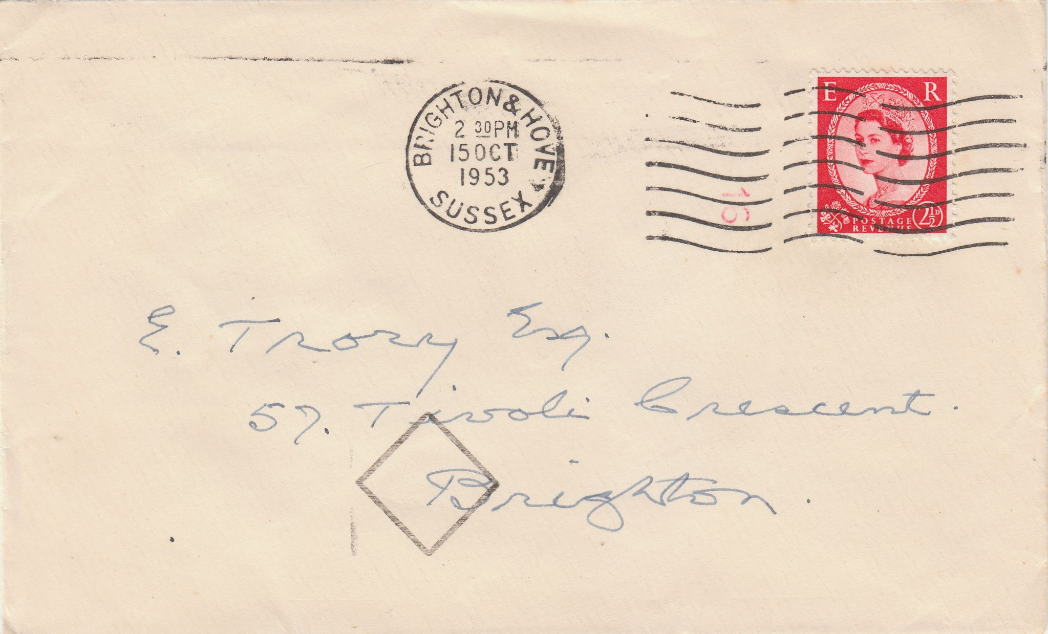 Bei der schwarzen Raute handelt es sich um einen Briefzählstempel, der in diesem Falle eindeutig am 15.10.1953 in Brighton eingesetzt wurde.