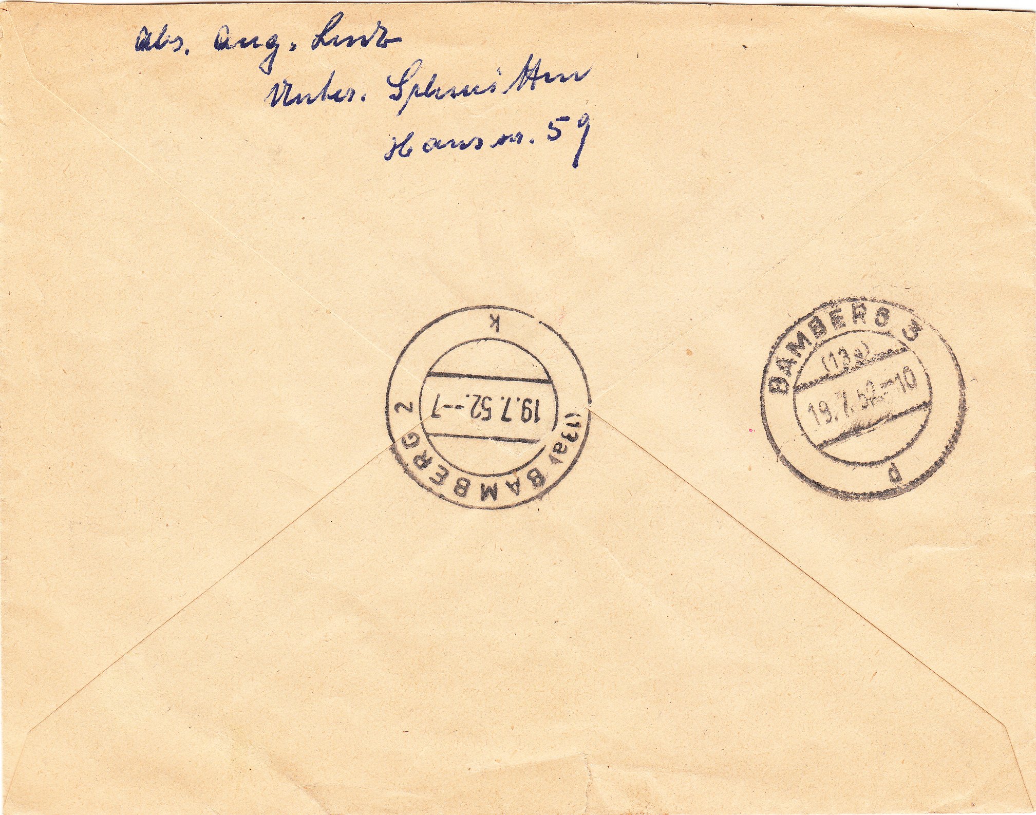 Postgeschichtlich interessant an diesem Beleg ist, dass der Dreieckstempel, der den Ablauf der einwöchigen Lagerzeit anzeigt, in diesem Falle der Dreieckstempel mit der "25", wohl gerade nicht zur Verfügung stand, weshalb ein entsprechender handschriftlicher Vermerk in Blaustift auf dem Beleg angebracht wurde!