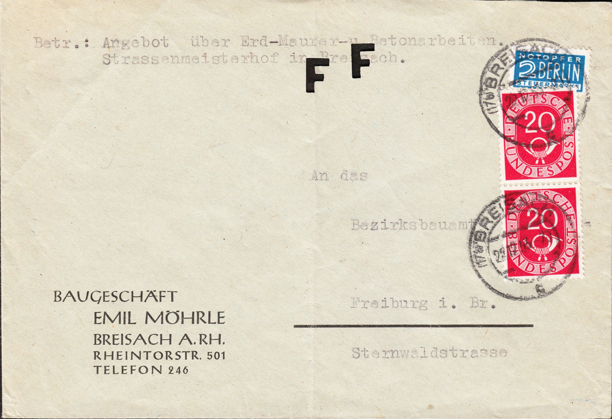Interessant ist die zweifache Lochung "F", mit der beim Bezirksbauamt Freiburg vermutlich Umschlag und Inhalt als zusammengehörige Einheit dokumentiert wurden, ging es doch um ein Angebot, vermutlich im Rahmen einer öffentlichen Ausschreibung.