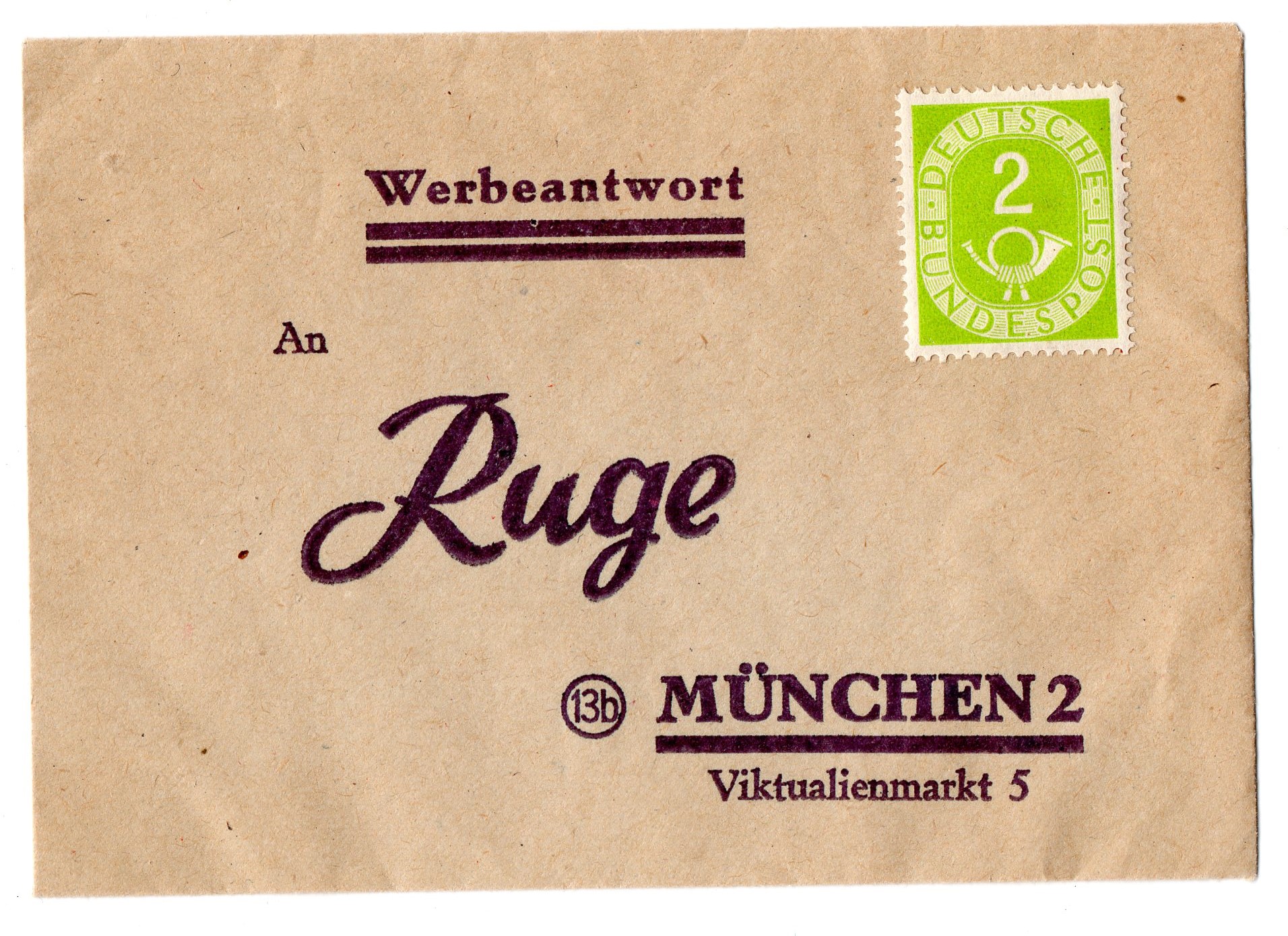 Mit der Nr. 123 für 2 Pfg ist meines Wissens keine Einzelfrankatur möglich. In einem großen Posten habe ich jetzt diesen Umschlag gefunden. Ich gehe davon aus, dass die 2 Pfg verklebt wurden um den Anreiz, diese Werbeantwort samt Bestellung zurückzusenden zu erhöhen. Vielleicht weiß ja jemand mehr darüber, auch darüber als was diese ungestempelte Marke zu bewerten ist. Im Zweifel siehts nur hübsch aus ;)