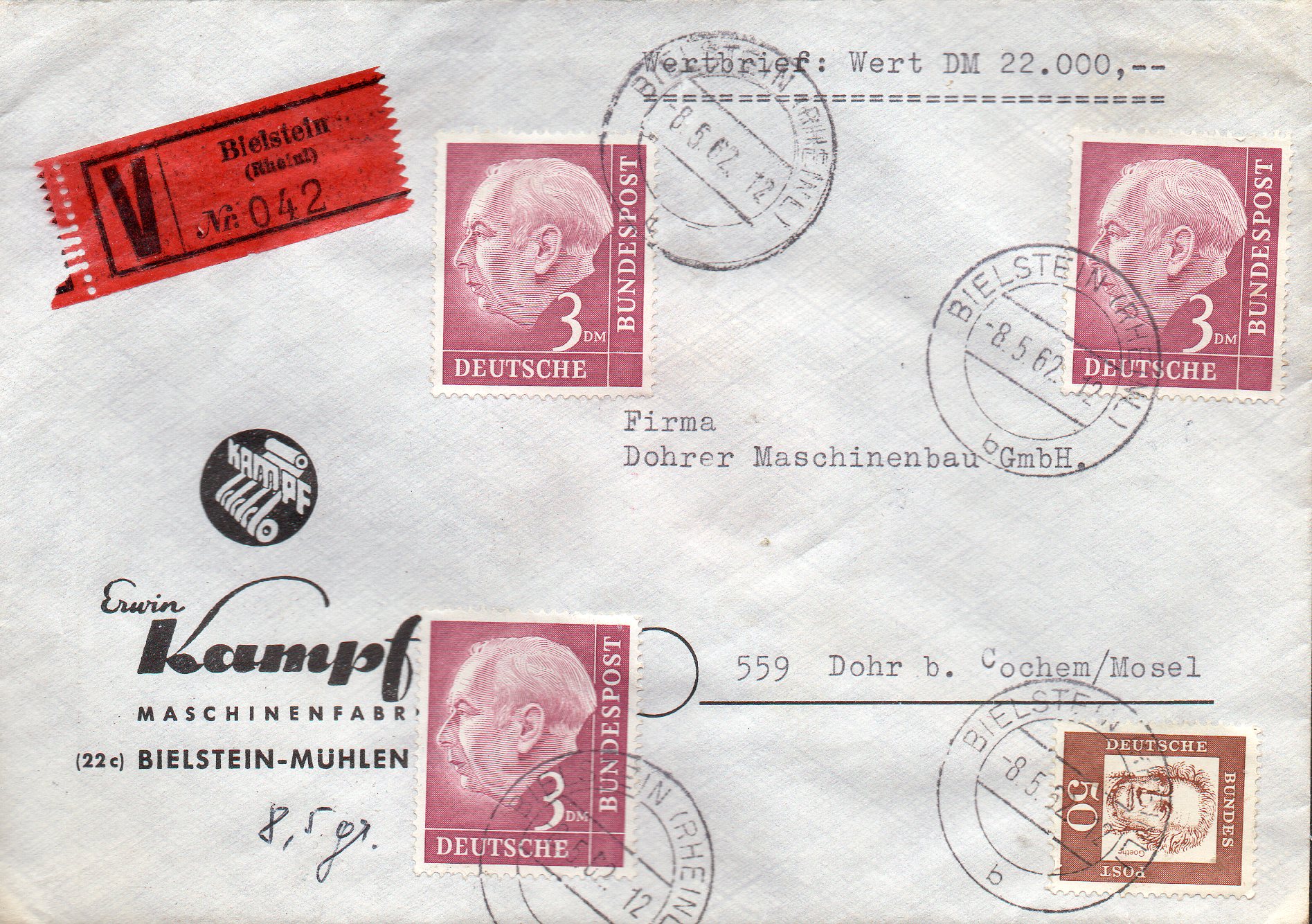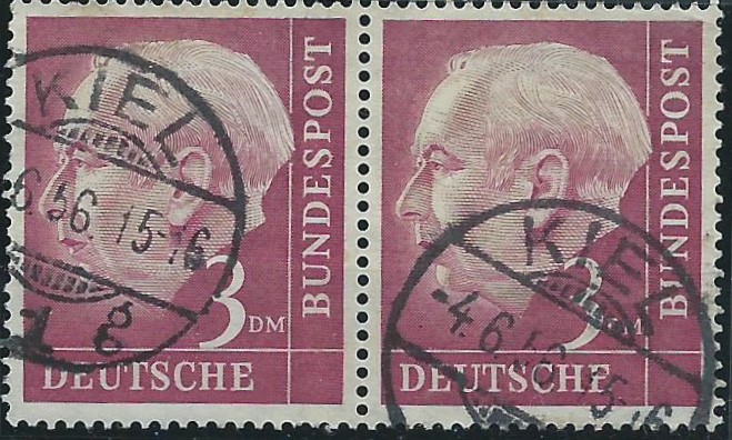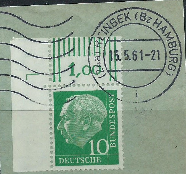 Gleicher Tauschtag, gleicher Tauschpartner: Eine rechte untere Bogenecke der Lumogen-25-Pf-Marke fand auch noch den Weg zu mir. Diese wurde gestempelt am 24.5.61 in Hamburg-Altona. Nun wird der eine oder andere fragen: Die Lumogen-Marken wurden doch in Darmstadt ausgegeben, wieso haben die Stempel aus Hamburg? Einfache Antwort: Seinerzeit wurden auch schon Marken über die Versandstellen an Sammler geliefert. Wenn nun ein Sammler in Hamburg oder wie im vorherigen Beitrag in Reinbek diese Marken bestellt hat, kann er sie auch dort stempeln lasssen, gültig waren sie ja im gesamten Bundesgebiet. Klar muss man schon oftmals 2 oder doch mehrmals genau hinsehen, ob die Stempel auch echt sind. Leider wird gerade mit den Lumogen-Marken sehr viel Schindluder getrieben! Wenn man sich nicht sicher ist, auf jeden Fall nur geprüfte Ware erwerben, bevor man sich da falsche Stempel in die Sammlung legt! Oder mit dem Tausch- bzw. Handelspartner eine Prüfung nebst Rückgaberecht aushandeln und die Marken zum zuständigen Prüfer schicken.