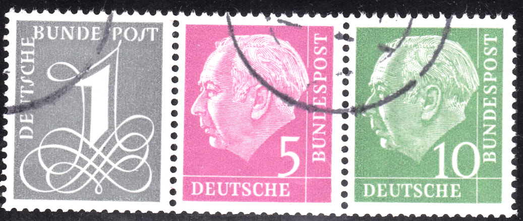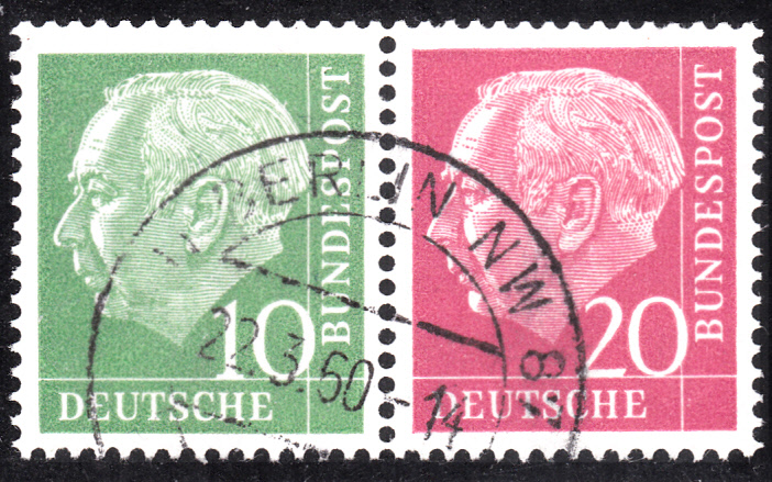 Gestempelter waagerechter Zusammendruck mit Zwischensteg MiNr WZ 16 b X (20Pf+Z b+1Pf) aus dem Markenheftchenbogen MiNr MHB 5 X. Der Zwischensteg b ist ohne Strichelleisten.