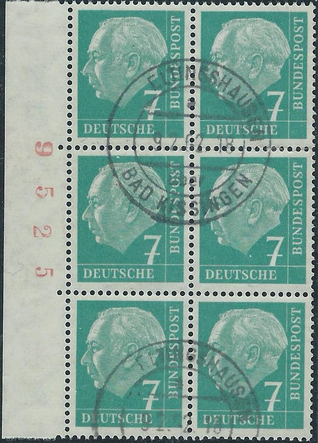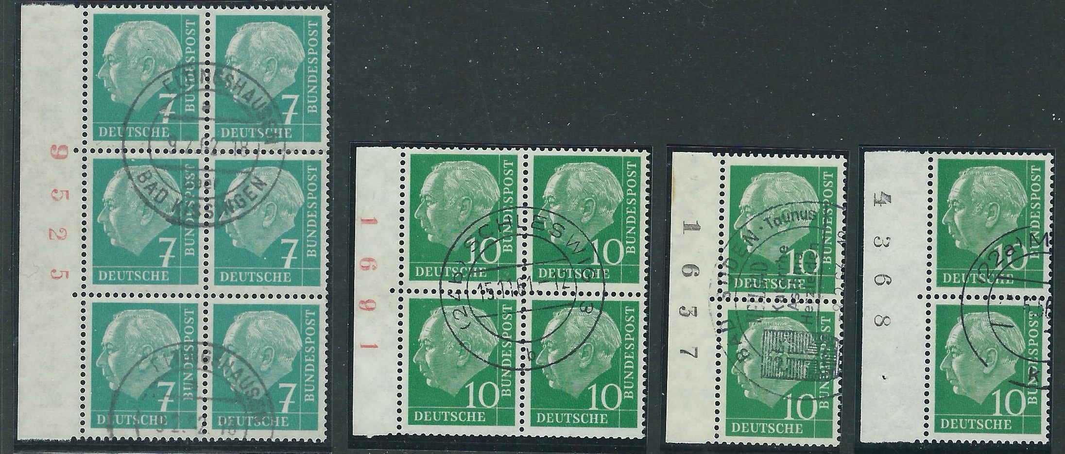 Und nun schauen wir uns erst einmal die Bogenränder an: Da erkennt man bei dem 7 Pf-Wert und dem 10 Pf (183 x)-Wert einen „normalen“ breiten Rand. Die beiden mittleren Stücke haben einen schmaleren Rand und man achte weiterhin auf die Stellung der Bogenzähler! Bei der 183 x ist die Nummer weiter nach links aussen versetzt und bei den Lumogen-Werten steht sie mehr nach rechts innen. Das sind schon mal Hinweise, die man vor Erwerb der Stücke so prüfen kann. Die Fluoreszenz-Lampe kommt natürlich auch zum Einsatz, um ganz sicher zu gehen.