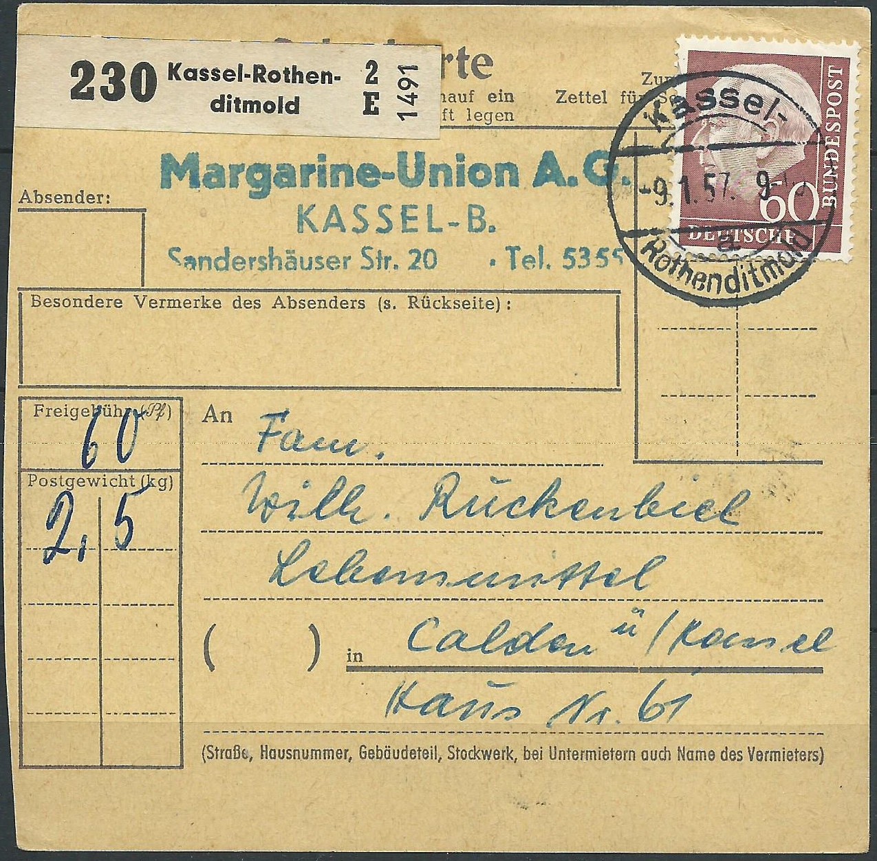 Noch eine weitere Paketkarte mit einem besonderen Stempel: Wiederum eine Marke zu 60 Pf, gestempelt wurde hier am 9.1.57 in Kassel-Rothendietmold. Hier haben wir kleine Buchstaben im Stempel, diese Form sieht man nicht alle Tage. Normalerweise waren die Buchstaben immer groß geschrieben.