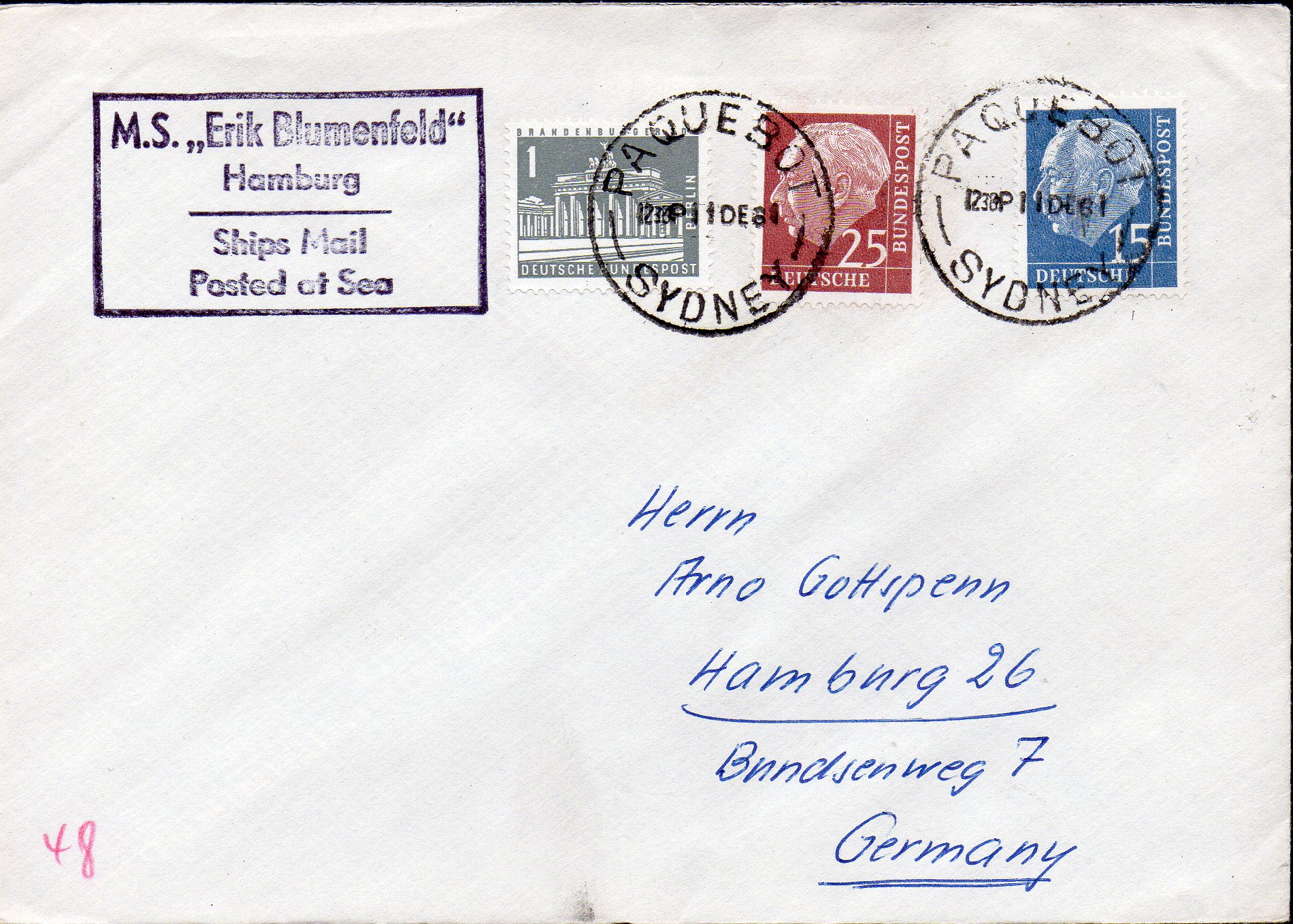 Schiffspost von der "Erik Blumenfeld" aus Belgien und Holland habe ich weiter oben schon gezeigt. Eine Entwertung der Marken im weit entfernten Sydney ist schon etwas ungewöhnlich.