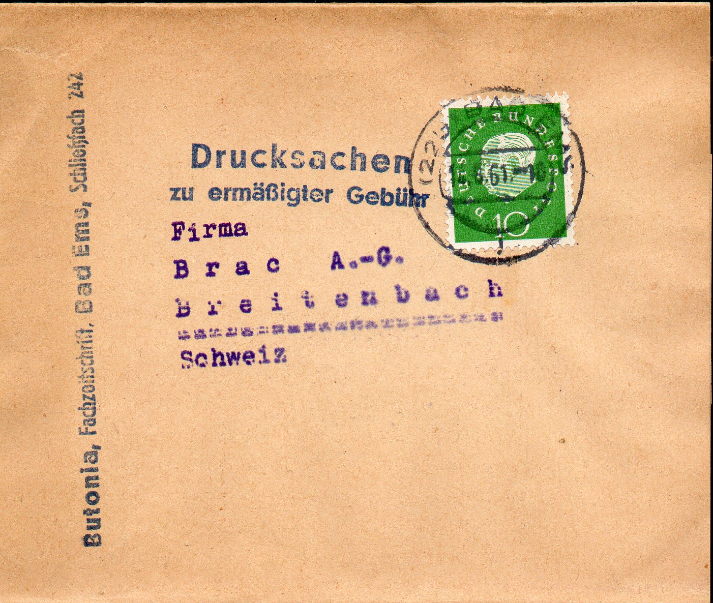 Als Drucksache zu ermäßigter Gebühr (Büchersendung) in das Ausland gelaufen ist diese Portostufe eher selten einmal anzutreffen, viele Streifbänder wurden entsorgt, und auch damaligen Briefmarkensammlern war eine grüne 10 Pfennig Heuss nicht wirklich einen zweiten Blick wert.