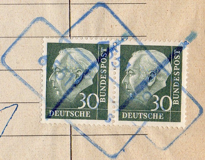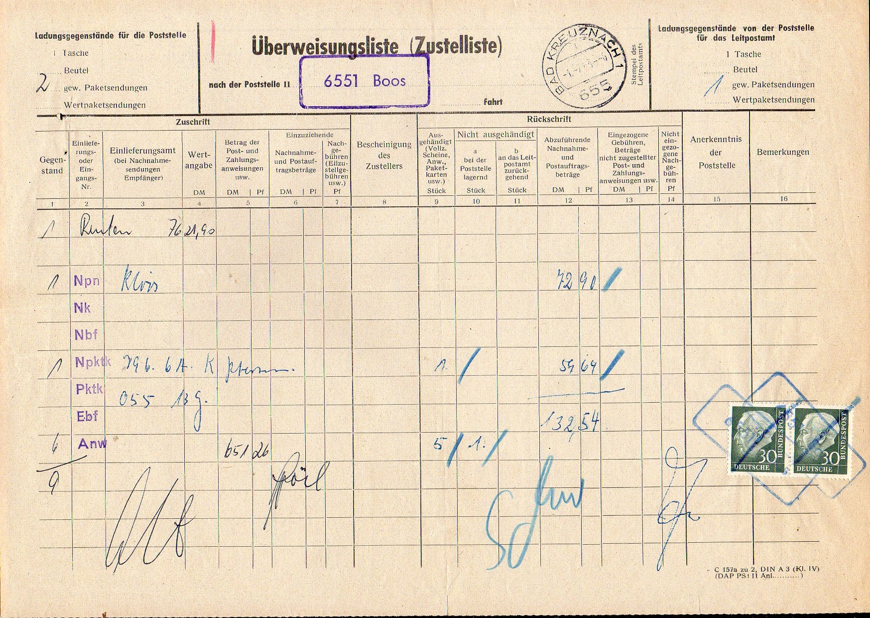 Die vom Paketboten für die Zustellung erhaltene Gebühr wurde auf den kleinen Poststellen (so genannten Poststellen II) auf Überweisungslisten in Briefmarken zu Abrechnungszwecken verklebt und handschriftlich sowie mit dem vorhandenen Stempel entwertet. Hier eine Überweisungsliste der Poststelle Boos mit einem waagerechten Paar des 30-Pfg.-Wertes Heuss II.