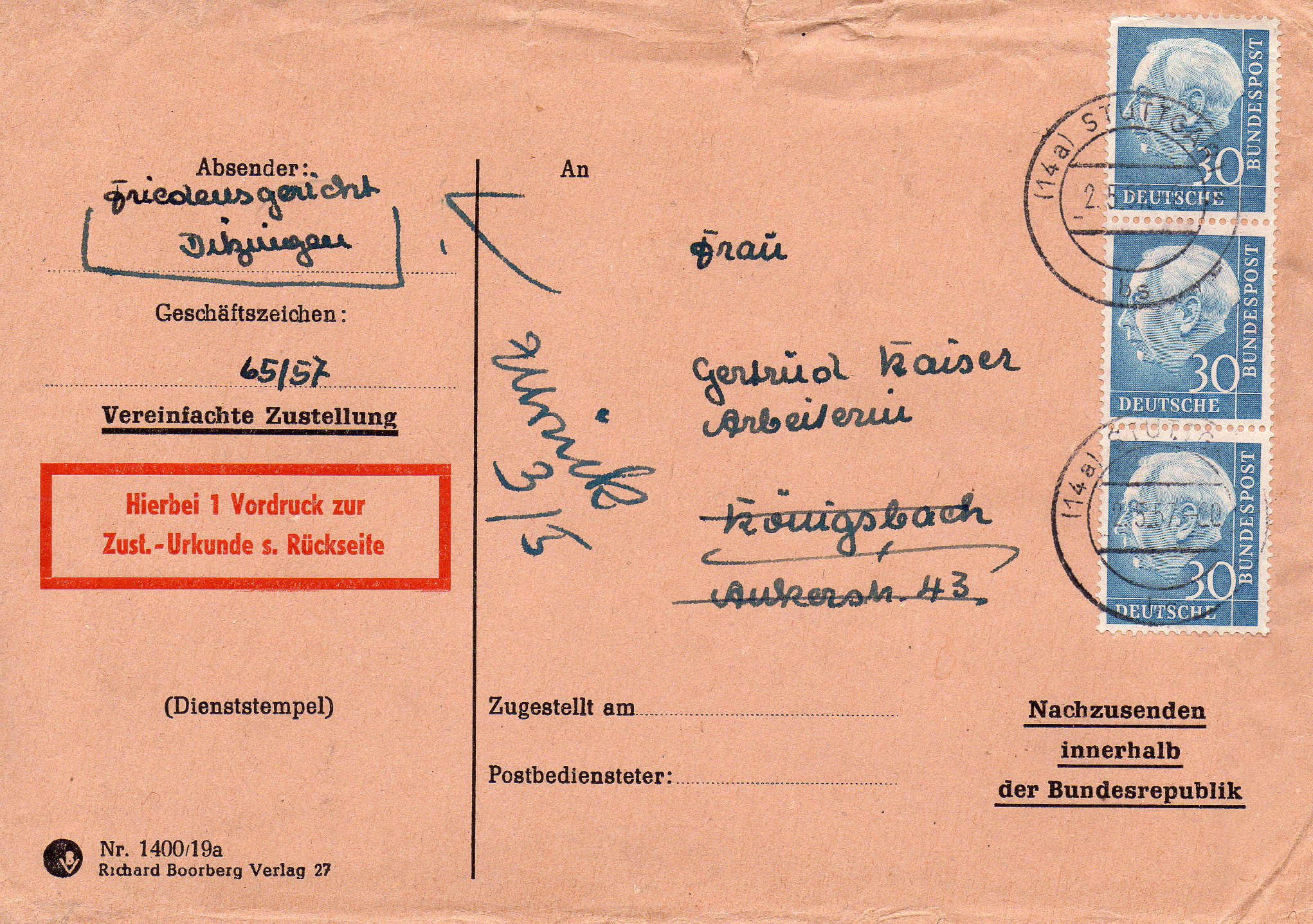 Heute zeige ich eine mit 3 Werten der 30-Pfg.-Marke portogerecht frankierte Zustellungsurkunde.
