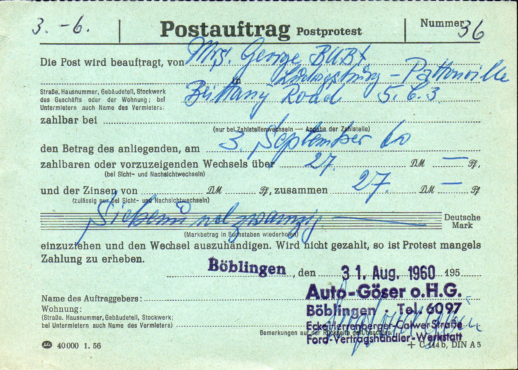 Dieser Umschlag wurde am 2.5.1957 ungewöhnlich spät gestempelt (20:00) und es wurde versucht, die Urkunde am nächsten Tag im etwa 60 km entfernten Königsbach zuzustellen.