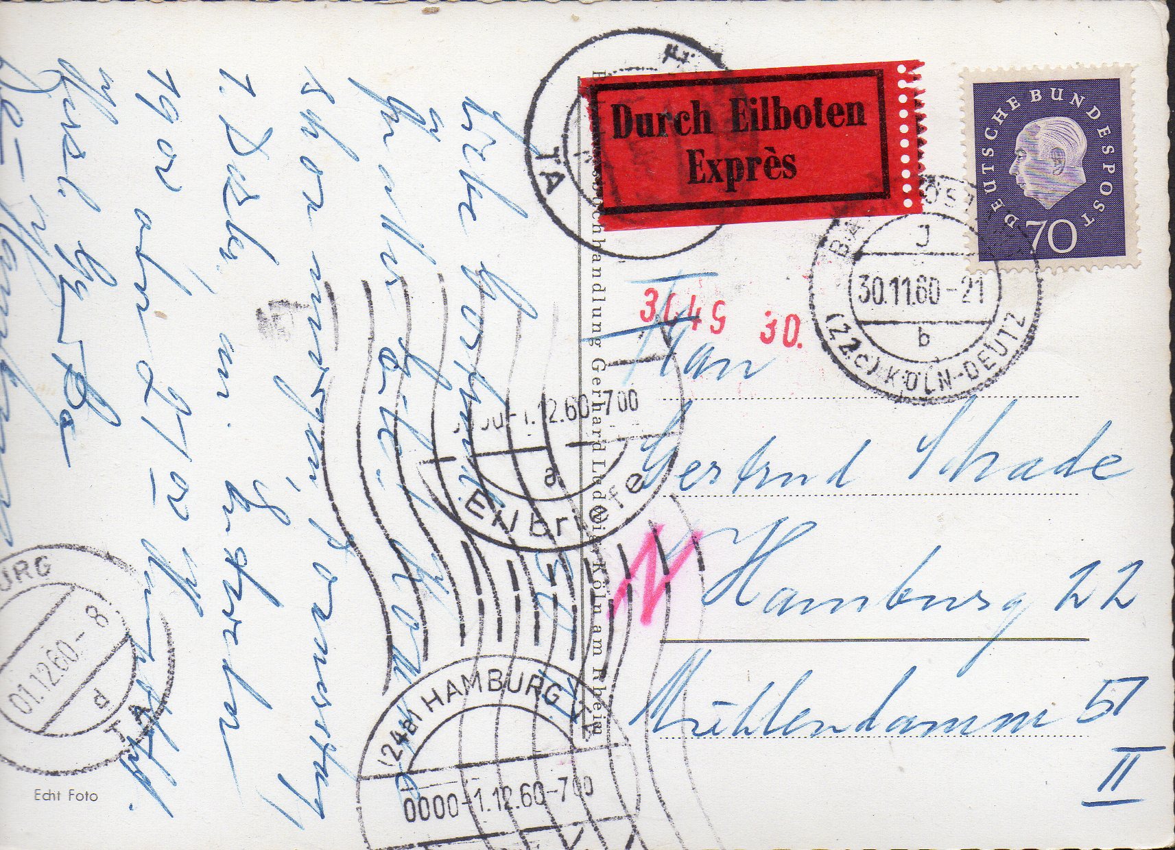 Diese Ansichtskarte von Köln nach Hamburg hatte es besonders eilig.