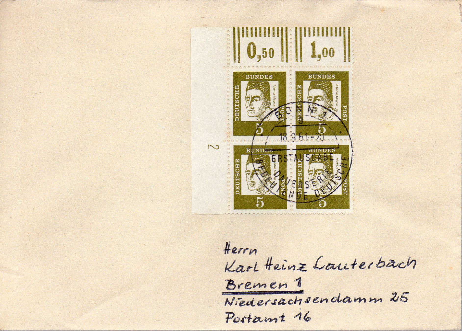 Ersttagsbrief mit Eckrandviererblock der 5-Pfg-Marke, Druckerzeichen 2