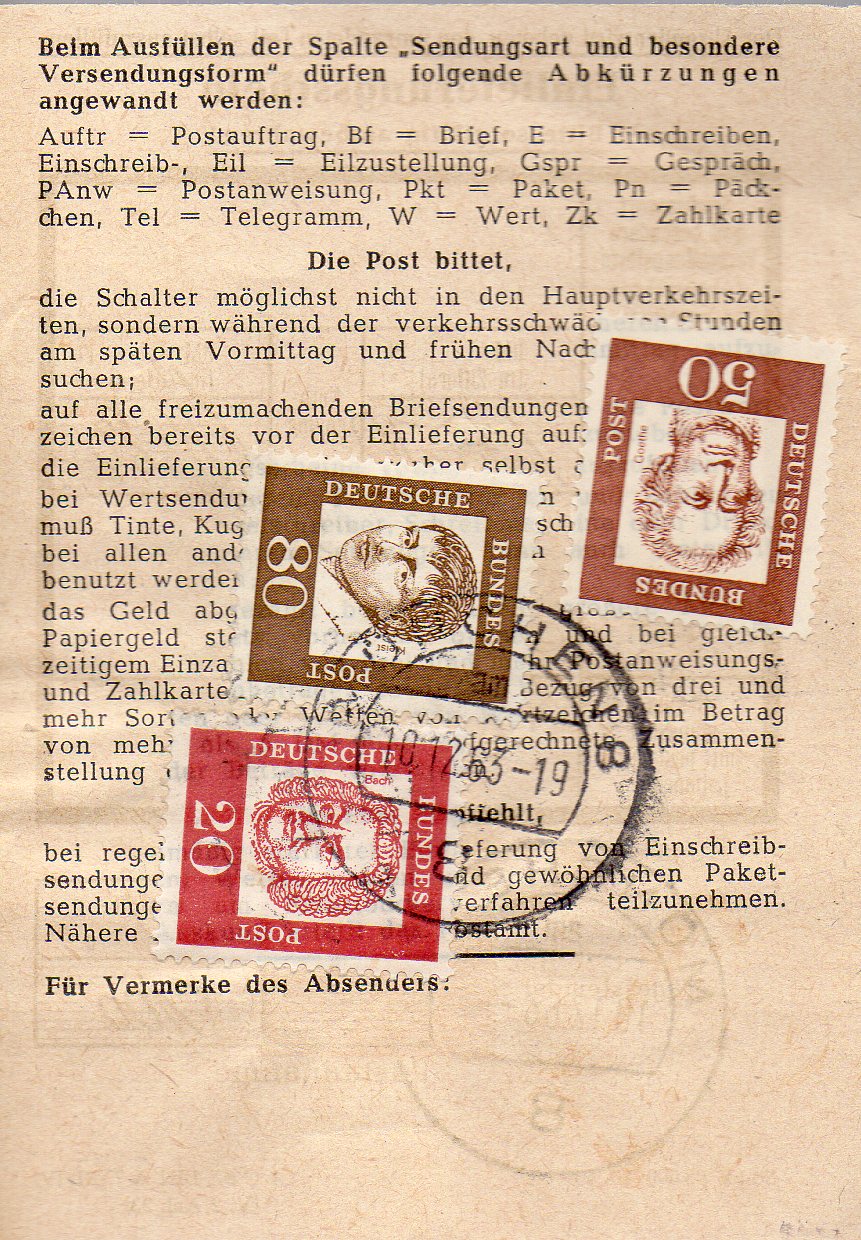 Einheiten der Dauerserie wurden meist von Sammlern verklebt, hier einmal ein Bedarfsbrief aus Bielefeld mit Nachgebühr, da das Sendungsgewicht über 20 g betrug.