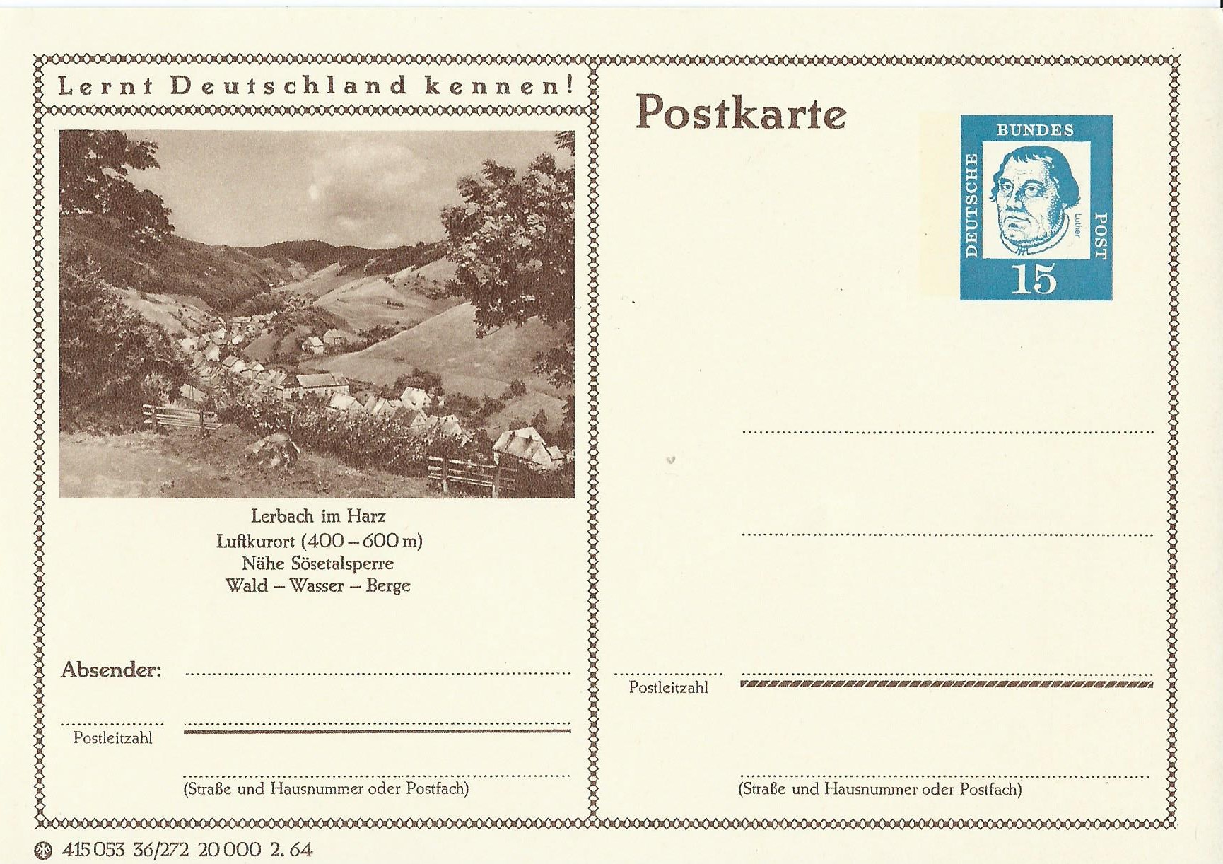 mir ist da noch eine weitere Bildpostkarte in die Hände gefallen, ebenfalls mit Wertstempel zu 15 Pf. Hier haben wir eine Ansicht von Leerbach im Harz aus der Serie „Lernt Deutschland kennen“.
