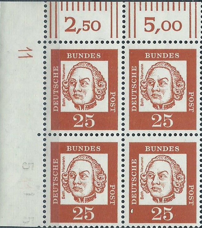 der 25 Pf-Wert als postfrischer 4-er-Block aus der linken oberen Bogenecke mit Druckerzeichen 11: