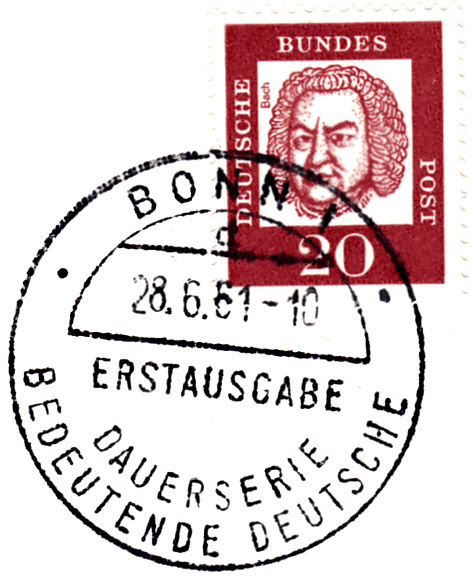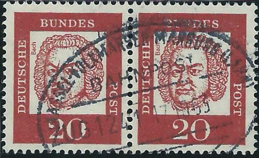 von der Serie Bedeutende Deutsche kann ich heute drei Neuzugänge zeigen. Den Anfang macht der Wert zu 20 Pf y als waagerechtes Paar, gestempelt mit einem ovalen Bahnpoststempel:
