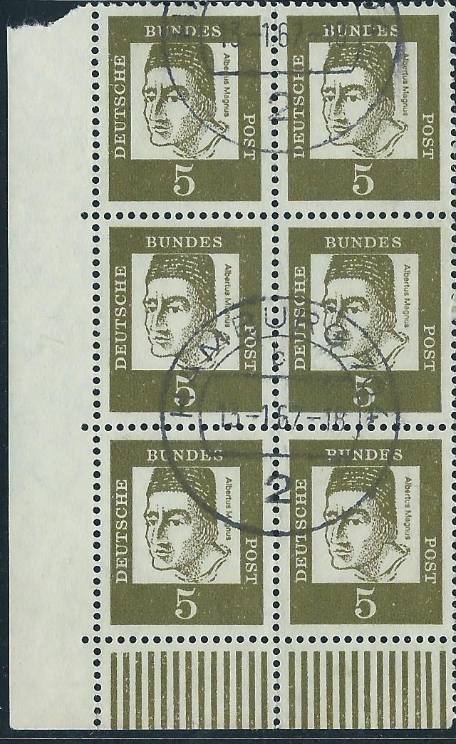 der Wert Bedeutende Deutsche 5 Pf Y aus der linken oberen Bogenecke als 4-er-Block. Auffällig ist hier der Buchstabe F im Markenrand. In einer Erstauflage wurde der Buchstabe als Unterscheidungsmerkmal zu den nicht fluoreszierenden Marken in der Druckerei zusätzlich zum Druckerzeichen mit auf den Bogenrand gedruckt. Gestempelt wurde der 4-er-Block in Kulmbach am 9.12.68.