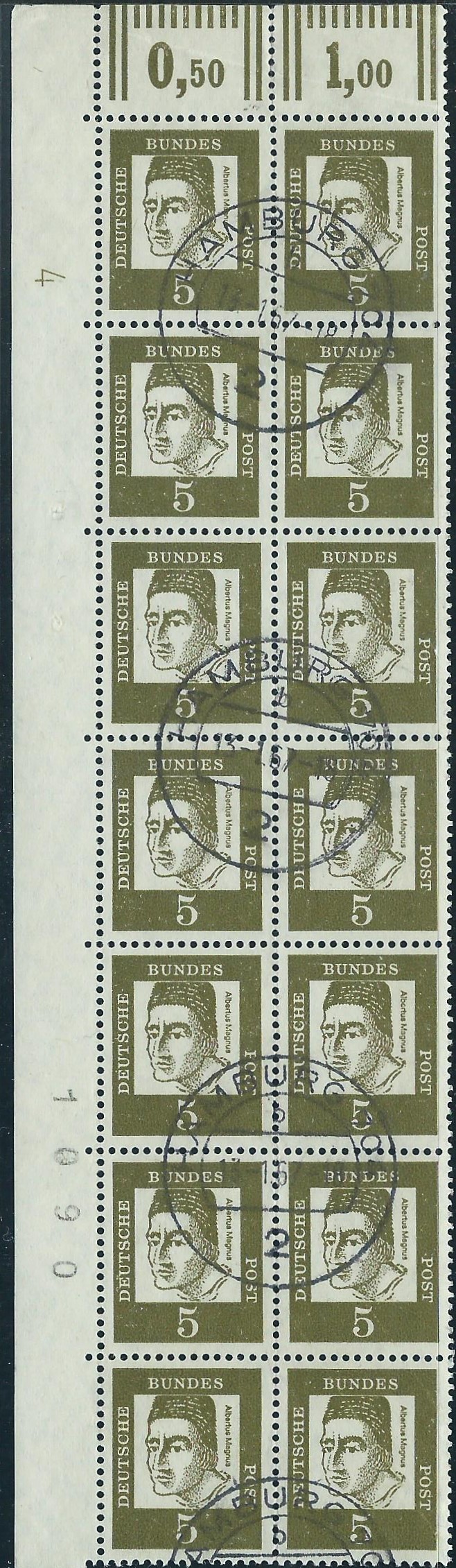 Und ein senkrechter 14-er-Block aus der linken oberen Bogenecke, ebenfalls gestempelt Hamburg 704 am 13.1.67. Hier finden wir am Rand noch das Druckerzeichen 4 links oben neben der Eckmarke und die Bogenzählnummer 1090 im unteren Bogenteil.