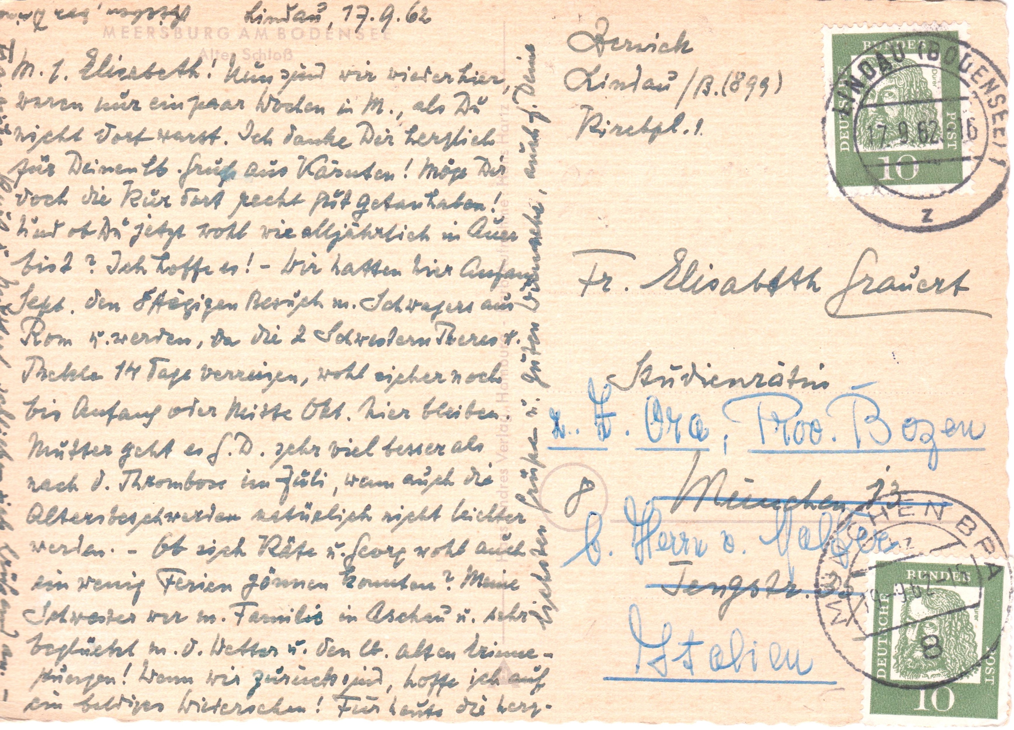 Diese nach München adressierte Postkarte wurde am 17.09.1962 in "LINDAU (BODENSEE) 1" freigemacht per Einzelfrankatur mit einem Postwertzeichen der Wertstufe 10 Pf der Dauererie Bedeutende Deutsche: