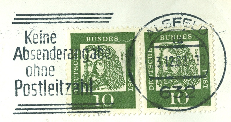 Den Anfang macht die 5 Pf in der Version x (nicht fluoreszierend), Unterscheidungsbuchstabe e, allerdings im oberen Teil und nicht wie bei der 2 DM links stehend.