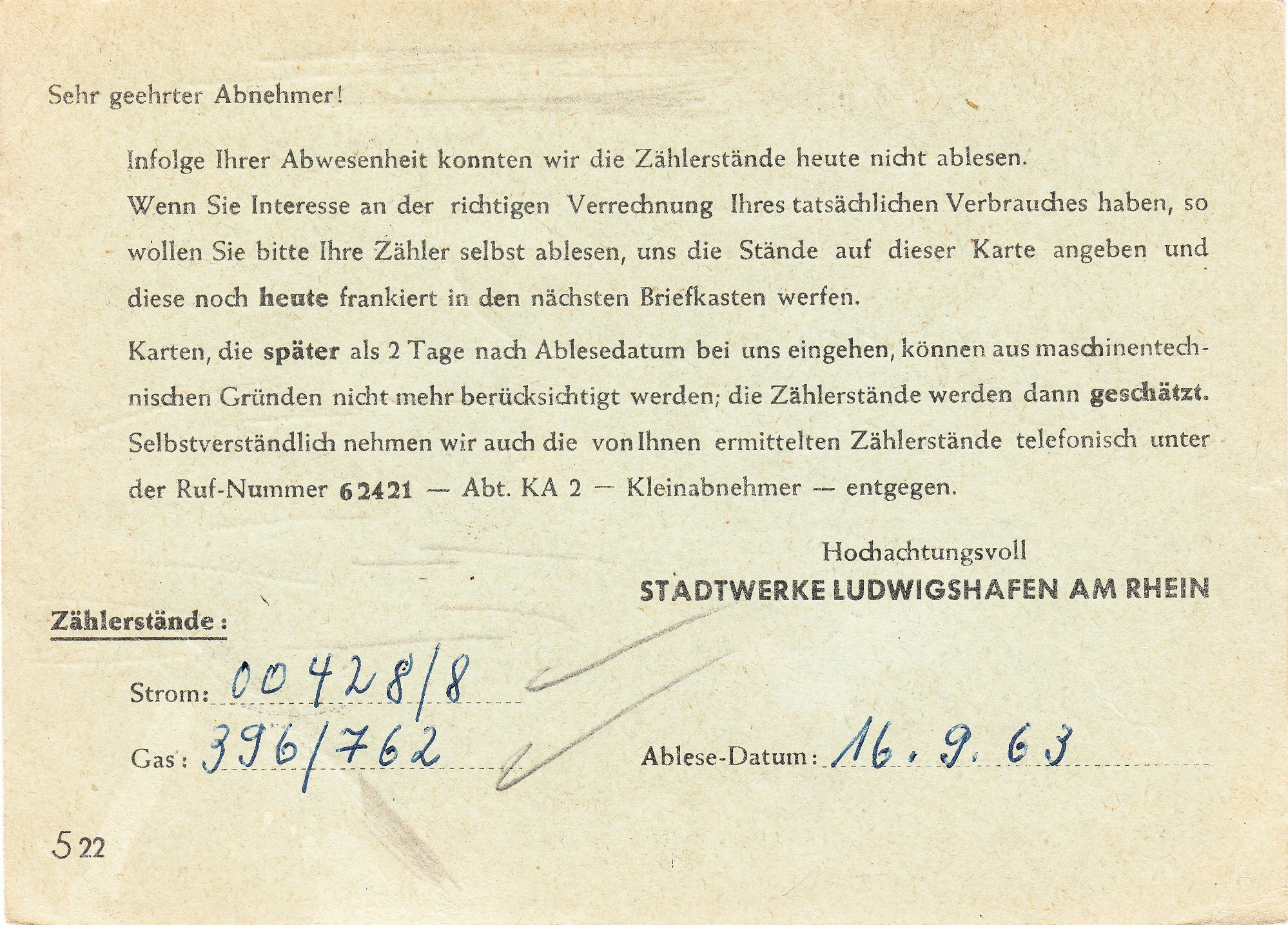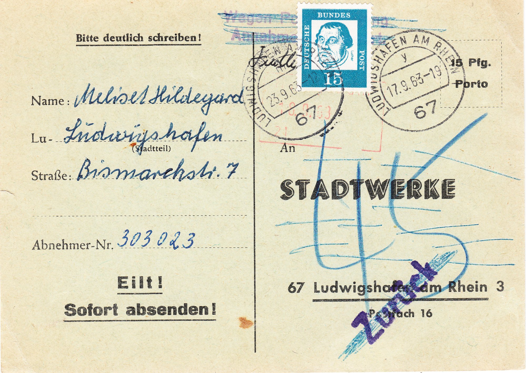 Diese Postkarte wurde am 17.09.1963 in LUDWIGSHAFEN AM RHEIN unfrankiert aufgegeben: