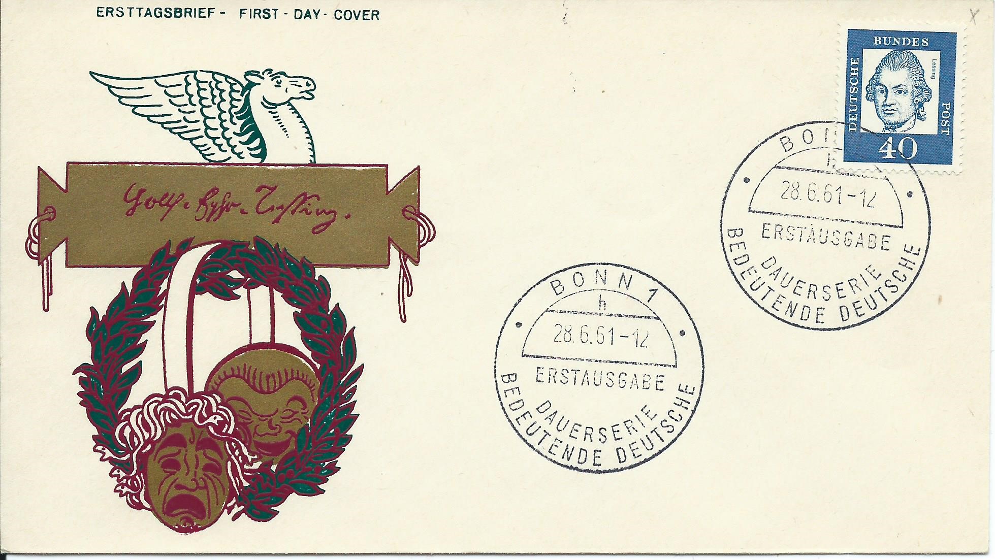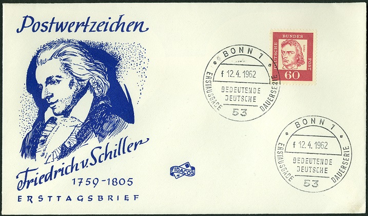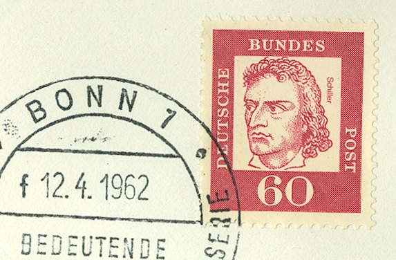 Zudem könnten Zusammenhänge zwischen Ersttag und Kennbuchstaben bestehen. Hier ein "Schiller" mit KB "f". Ebenfalls mit Ersttag 12.4.1962.