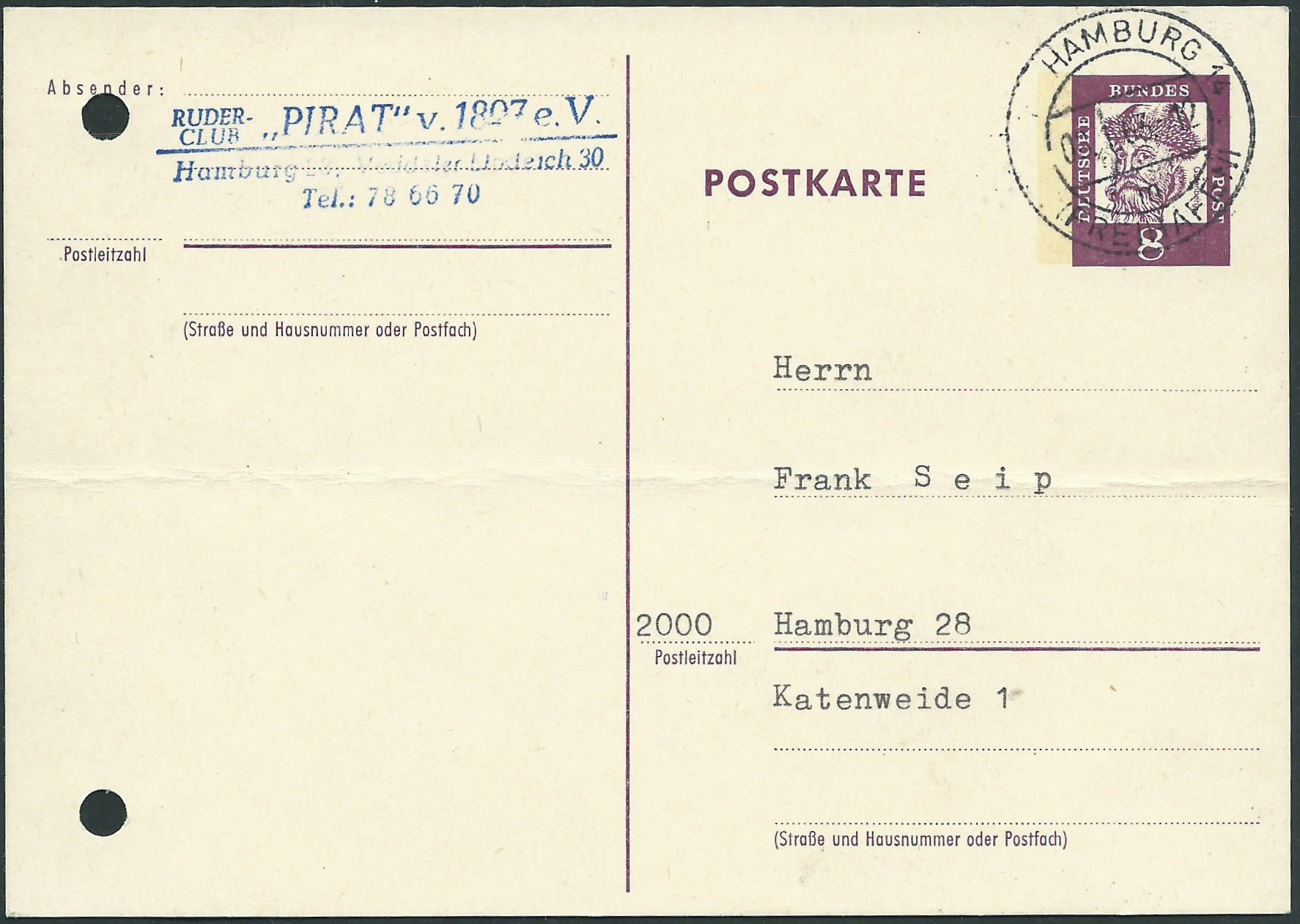 So weit auf den ersten Blick nichts besonderes, mag man denken. Ausgezeichnet war sie mit "P73" und "125,--Mi€". Daneben klebte dann auf der Verpackung noch der eigentliche Verkaufspreis. Klar, der ernsthafte Sammler schreit jetzt entsetzt: "AKTENLOCHUNG!!!" Das war mir im ersten Moment auch bewusst, aber mein Blick fällt ja vor allem anderen immer erst mal auf den Stempel. Und da ist das richtig Besondere: Hamburg 14 FREIHAFEN, datiert vom 8.1.63. Da ich so einen Hamburger Heimatsammler (insbesondere für den Freihafen) kenne ;) , welcher mich auch schon mal auf solche Stempel aufmerksam gemacht hat, habe ich das Stück dann schnellstens verhaftet. Zumal so eine späte Verwendung sicherlich auch nicht häufig zu finden sein dürfte, da ja bekanntlich ab dem 1.1.62 die neuen Stempel mit den Postleitzahlen unten eingeführt wurden und unter anderem diese Stempeltype aus dem Verkehr gezogen wurde. Und ich denke mal, dass selbst ein qualitätsbewusster Belegesammler wie unser Freund Rainer sich über diese Postkarte freuen wird, oder? ;)
