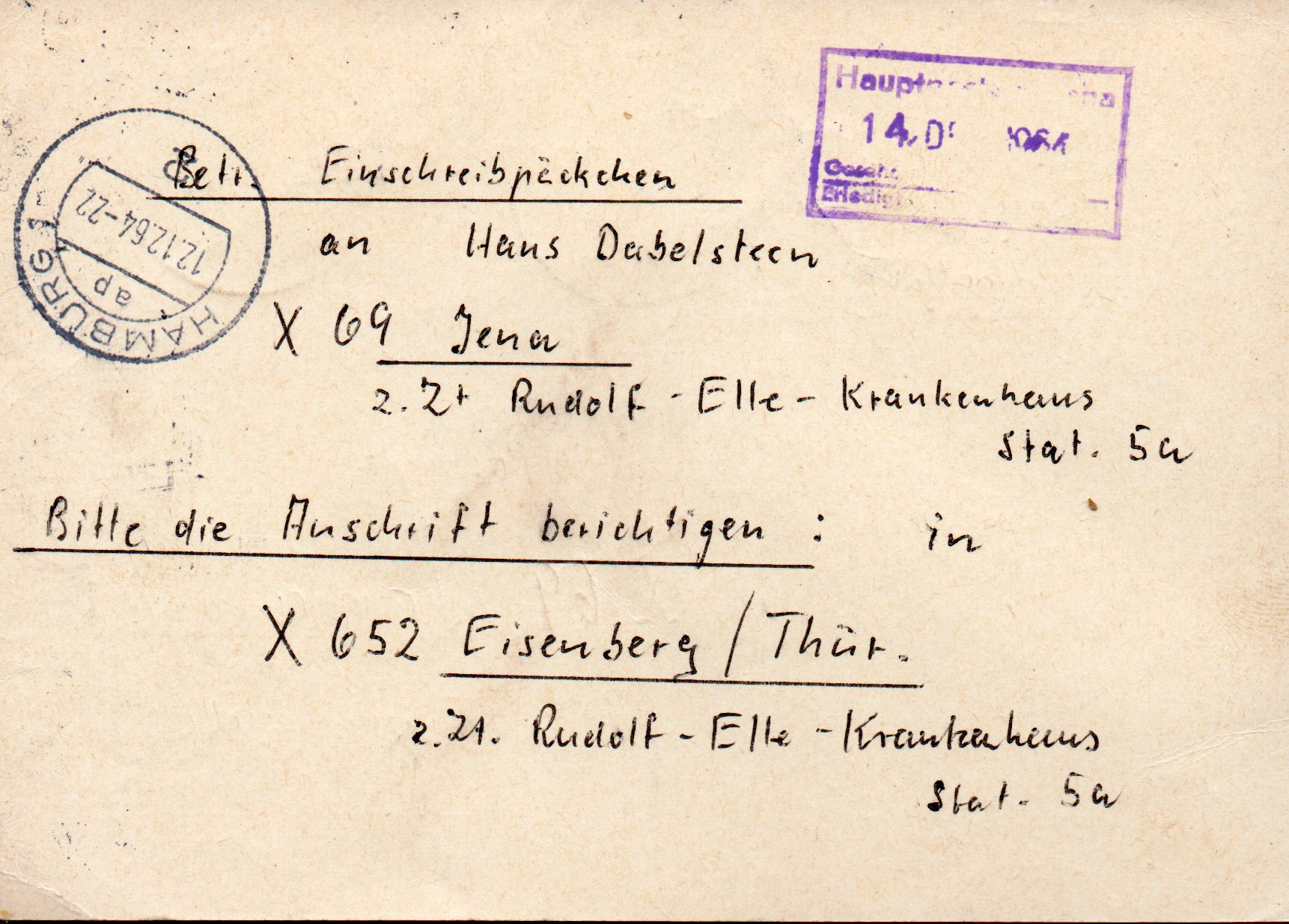 Der nicht genannte Absender schickte ein Einschreibpäckchen nach Jena. Wenig später bemerkte er seinen Fehler, das Rudolf-Elke-Krankenhaus, in dem Herr Dabelsteen lag, war nicht in Jena sondern in Fürstenberg. Mit der schnellen Postkarte sollte verhindert werden, das dieses Päckchen zurück an den Absender geschickt wurde. Ob es geklappt hat???