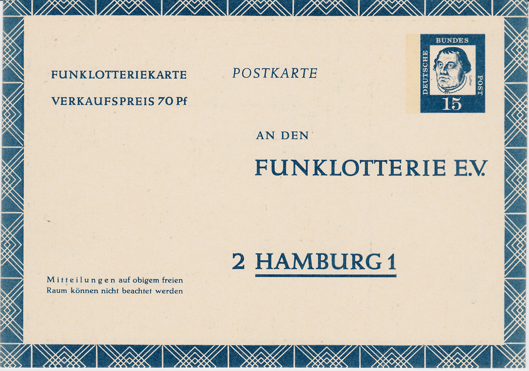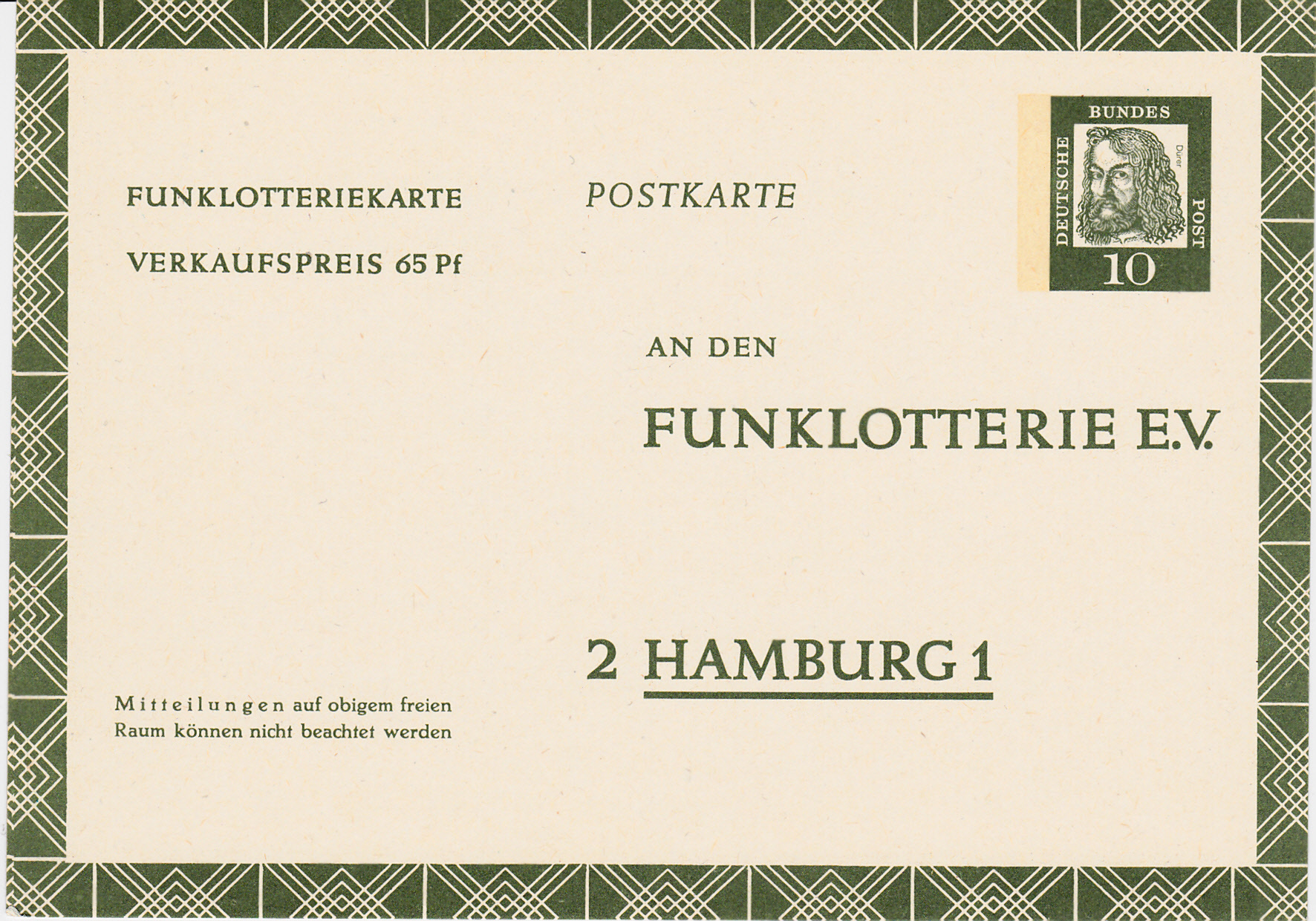 Auf Veranlassung der Deutschen Hilfsgemeinschaft für die Funklotterie des Nordwestdeutschen Rundfunks wurden seit 1949 sogenannte Funklotterie-Postkarten hergestellt und an den Postschaltern zu einem Preis von 70Pf und ab 6.8.1951 für 65Pf verkauft. Nach Abzug ihrer Kosten führte die Post 50Pf (zwischenzeitlich auch 55Pf) an die Hilfsgemeinschaft ab.