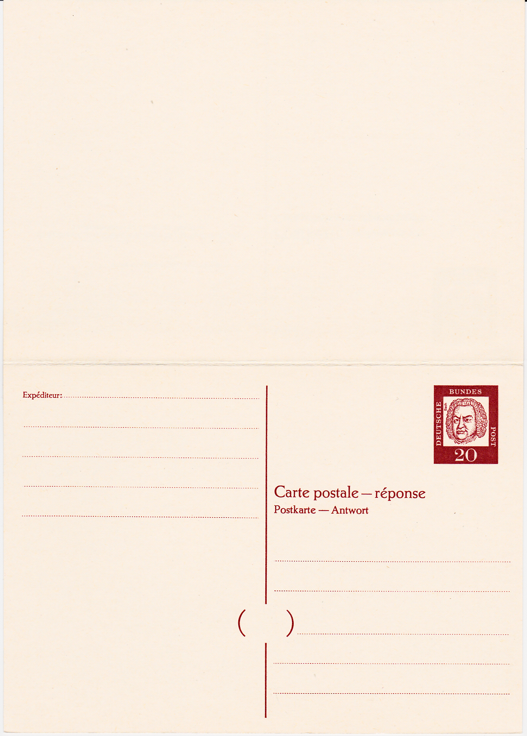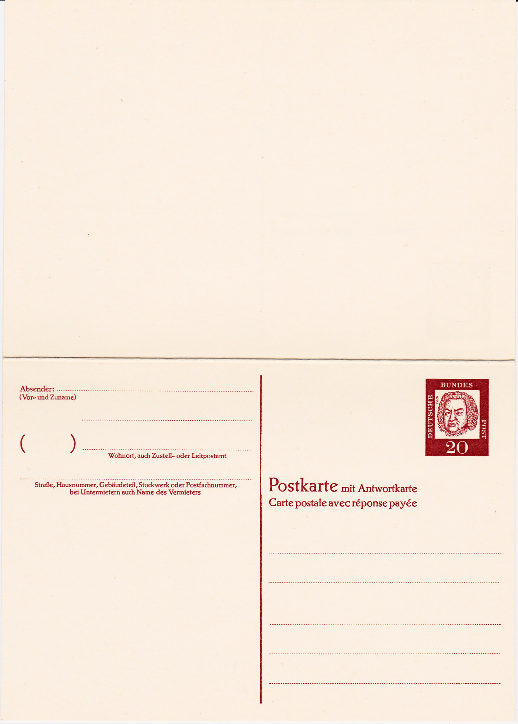 Unbenutzte Postkarte mit Antwortkarte Ausland mit anhängender Antwortkarte mit Wertstempeleindruck der 20Pf-Marke der DS Bedeutende Deutsche ohne Fluoreszenzbalken (MiNr P 64).