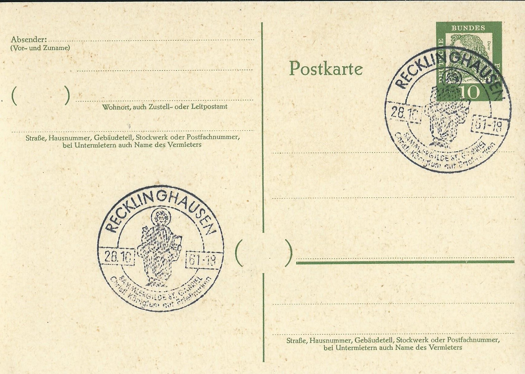 Zum einen der Wertstempel zu 10 Pf als „normale“ Postkarte. Sie wurde am 28.10.61 in Recklinghausen mit einem Sonderstempel gestempelt und wurde nicht befördert.