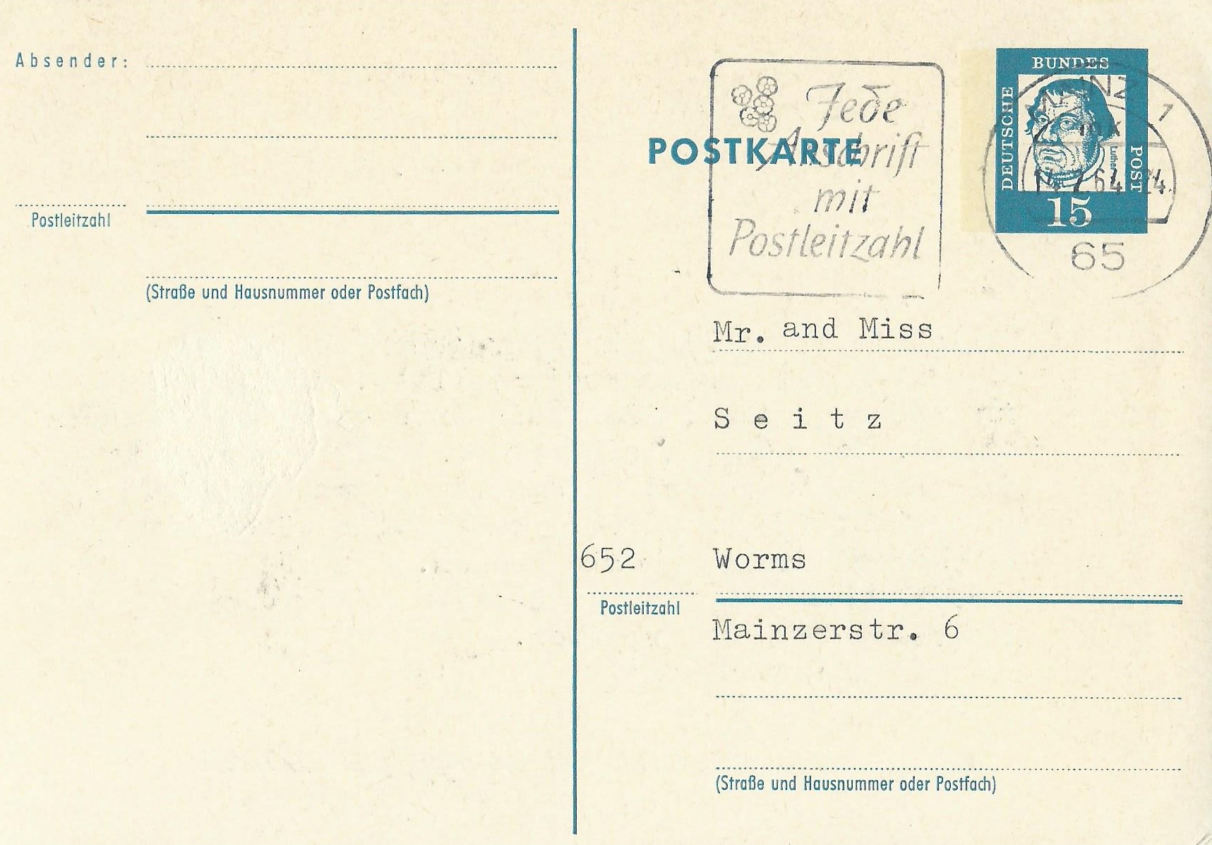 Die alte Postleitzahl wurde wie man deutlich erkennt übrigens aus diesem Stempel oben links herausaptiert!