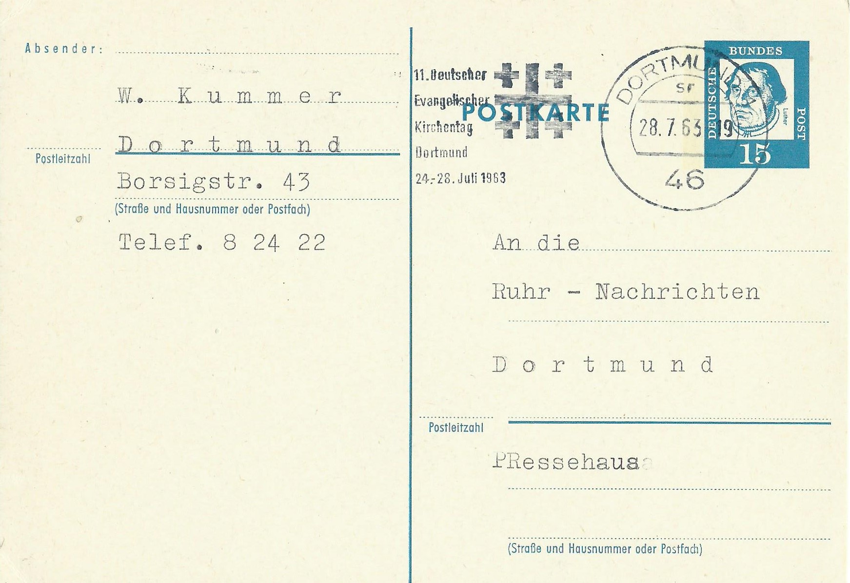 Noch eine weitere Postkarte zu 15 Pf, diese wurde in Dortmund am 28.7.63 gestempelt.
