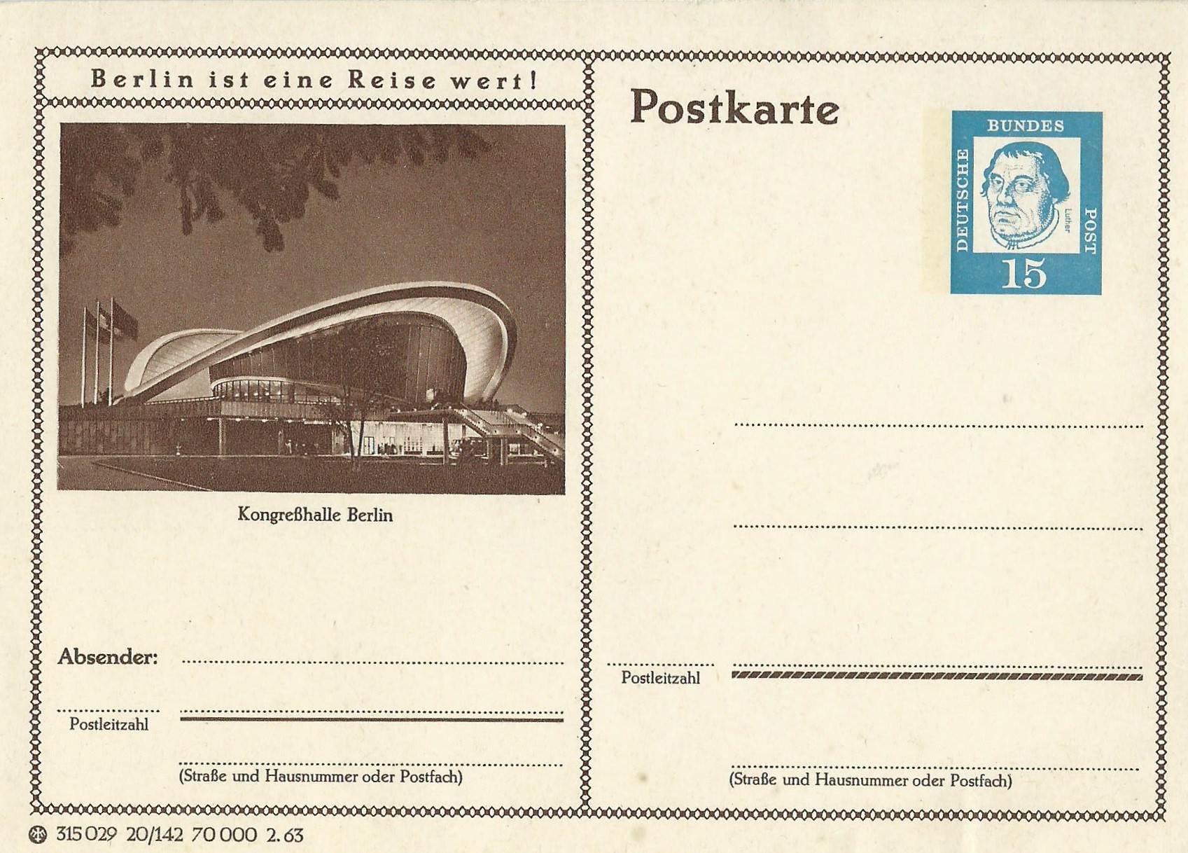 Dazu noch eine ungebrauchte Bildpostkarte zu 15 Pf mit der Ansicht der Kongresshalle in Berlin.