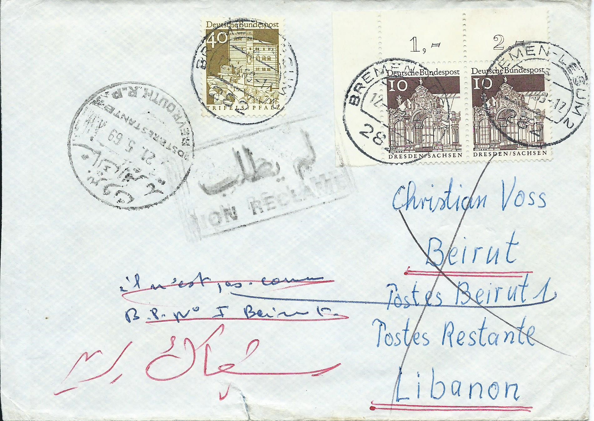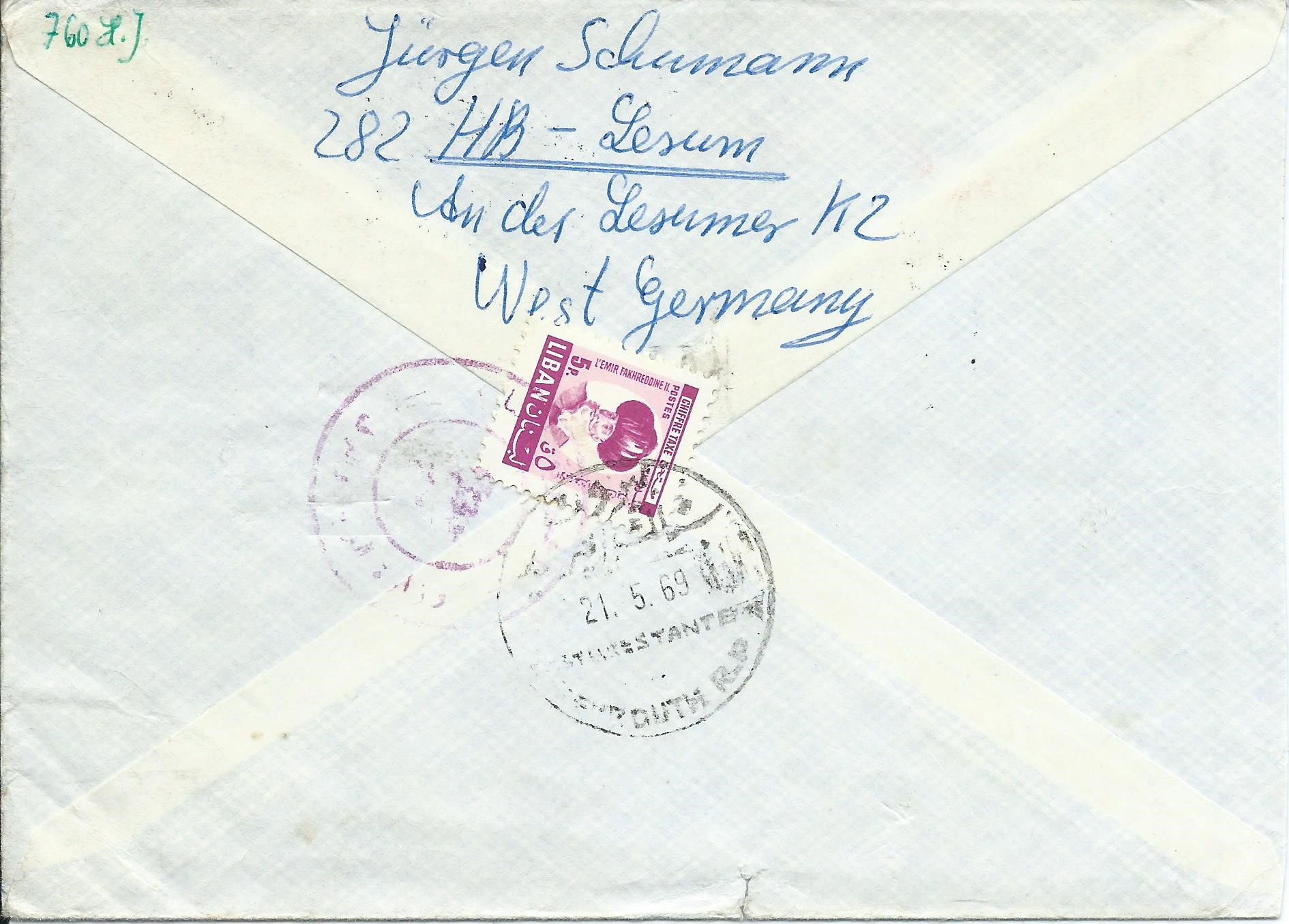Als nächsten Beleg zeige ich eine Mischfrankatur zwischen einer Marke zu 40 Pf und einem linken Eckrandpaar 10 Pf als Brief in den Libanon. Da kein Luftpostaufkleber auf dem Umschlag angebracht wurde, lief der Beleg über Land-/Seeweg und das entsprechend länger. Abgestempelt wurde er am 12.4.69 in Bremen und die weiteren Stempel auf dem Beleg datieren vom 21.5.69 (Vorder- und Rückseite) So wie das aussieht, hat der Empfänger den Brief vor Ort nicht erhalten und er lief zurück an den Absender. Interessant ist auch die auf der Rückseite verklebte weitere Marke aus dem Libanon. War die nun als Lagergebühr für das Postamt gedacht oder wurde sie für die Rücksendung gebraucht? Eventuell kann uns da mal ein Briefe-Experte aufkären.