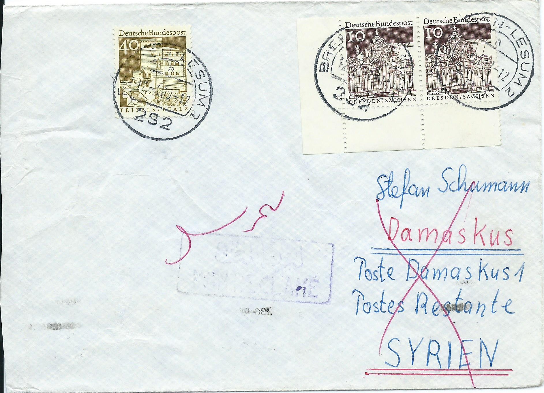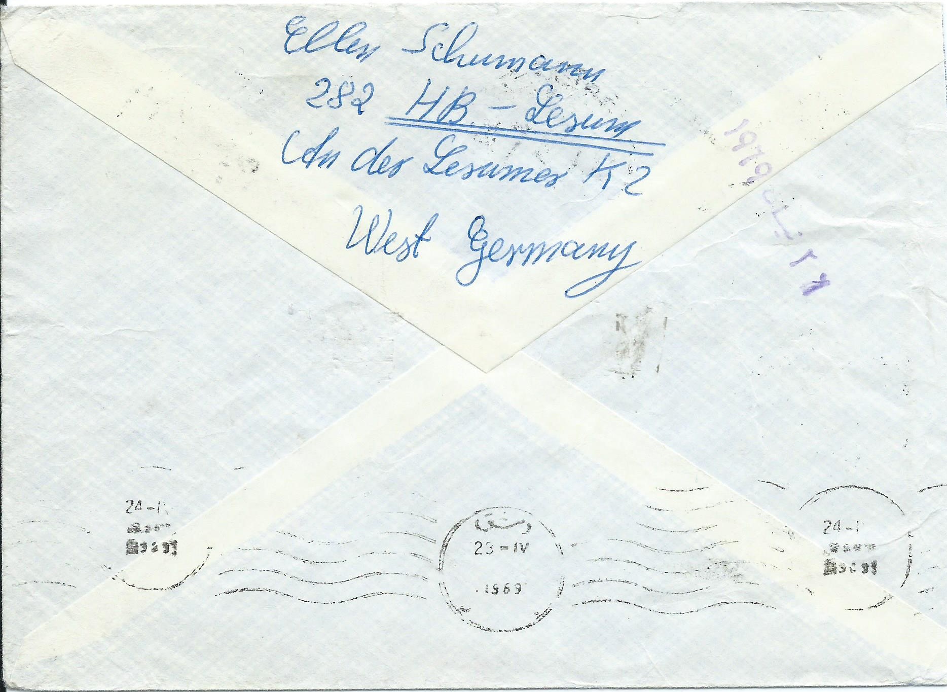 Ein ähnlicher Brief ging auch nach Syrien. Hier wieder eine 40 Pf Marke und ein linkes unteres Eckrandpaar 10 Pf als Frankatur, auch am 12.4.69 in Bremen abgestempelt. Der wurde schneller bearbeitet, auf der Rückseite ist ein Stempel vom 23.4.69 angebracht worden.
