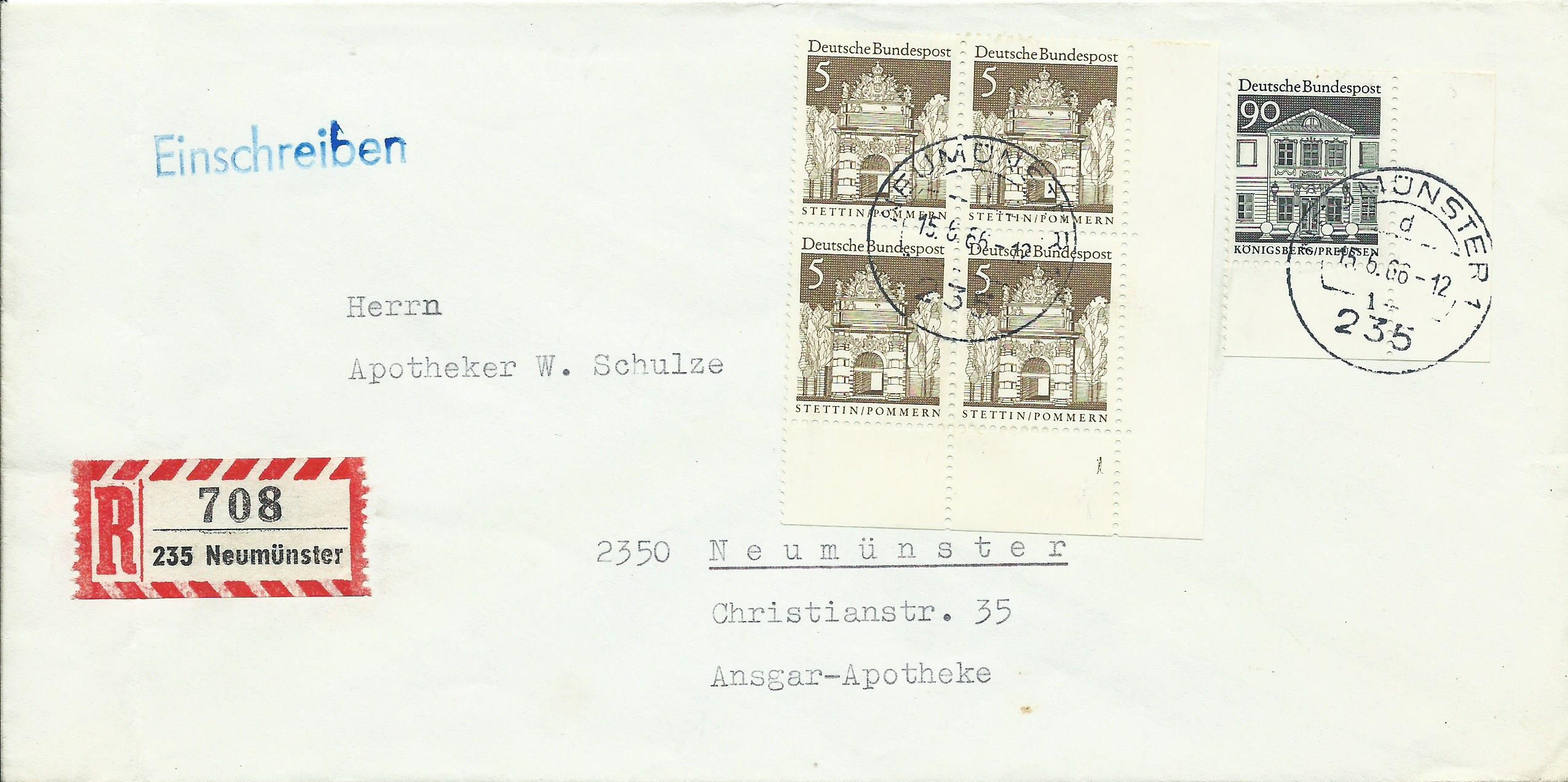 Nun folgt ein schöner Beleg, der als Orts-Einschreiben aufgegeben wurde. Als Frankatur dienten ein 4-er-Block 5 Pf aus der rechten unteren Bogenecke mit Formnummer 1 sowie eine 90 Pf-Marke ebenfalls aus der rechten unteren Bogenecke mit Formnummer 1. Abgestempelt wurde der Brief am 15.6.66 in Neumünster. Kleines Schmankerl am Rande: Der 15.6.66 war der Ausgabetag der beiden Marken, somit haben wir hier einen perfekten Ersttagsbeleg!