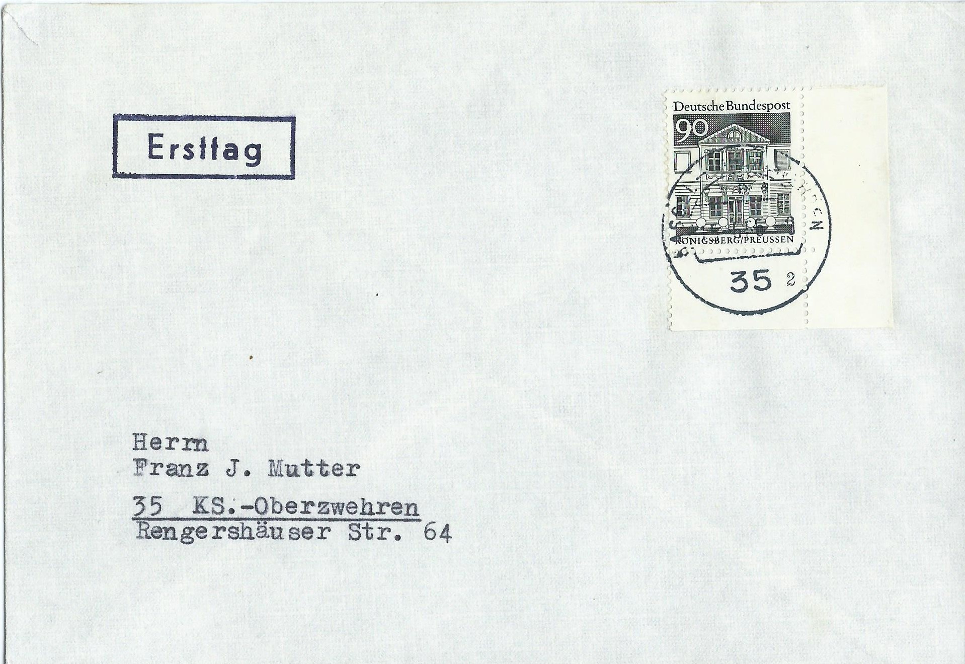 Beim letzten Beleg für heute hat der Absender uns die Überraschung von eben schon vorweggenommen. Er hat einen Zusatzstempel "Ersttag" oben links auf den Umschalg gesetzt. Die Marke zu 90 Pf ist wieder aus der rechten unteren Bogenecke und hat die Formnummer 2. Der Stempel vom 15.6.66 ist in Kassel abgeschlagen worden. Dieser Beleg ist allerdings hoffnungslos überfrankiert. Aber auf Grund der Formnummer mochte ich ihn dann doch nicht liegen lassen ;)