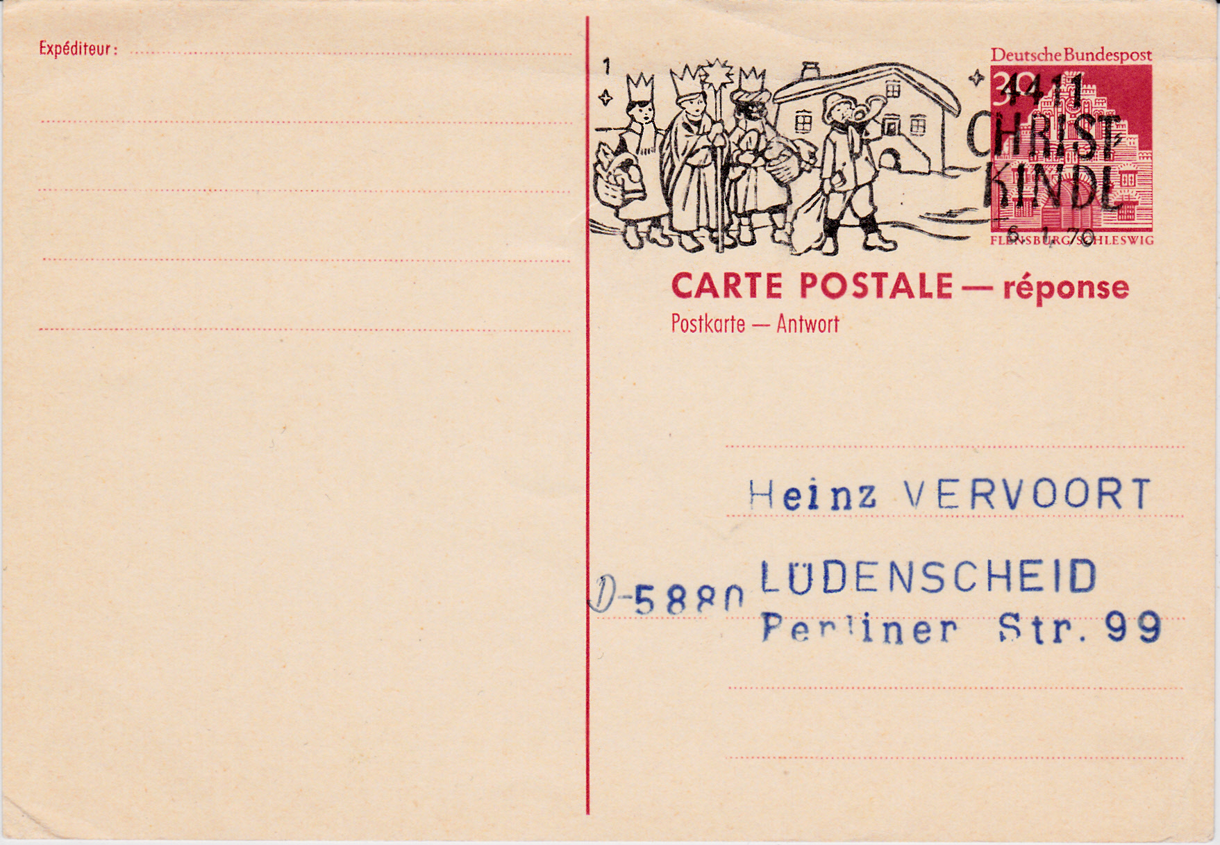 Der Antwortteil (MiNr P 95 A) einer Auslandspostkarte mit Antwortkarte wurde hier benutzt, um einen Sonderstempel aus Christkindl zu erhalten.